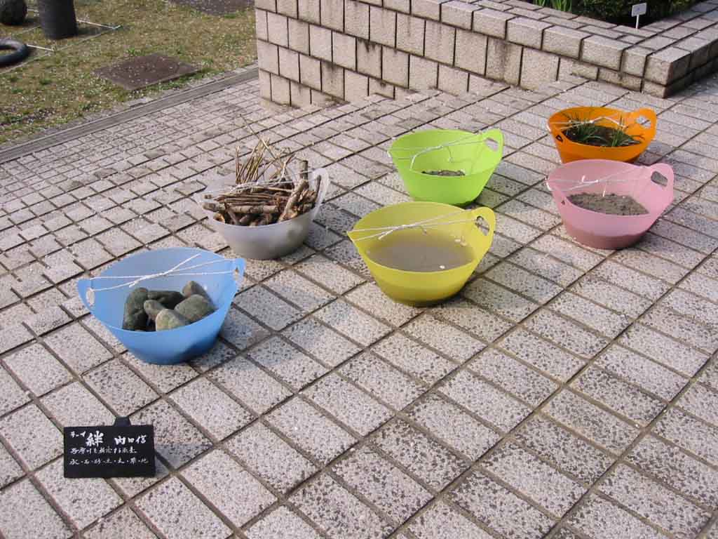 5内田 信「絆」水・石・砂・土・木草・空気・容器「絆」をテーマに30数年が経過した。私を含め、人と人との関わりは一つの社会を構成する中でさけて通れない現実である。この現実は誰しも生ある限り続く事実を否定できないであろう。今回は、多摩川を構成する要素(水・石・砂・土・木草・空気)を博物館に展示することにしました。