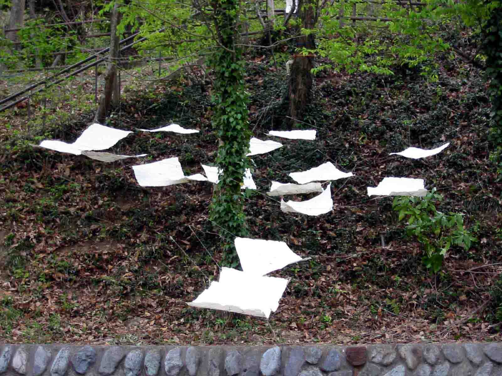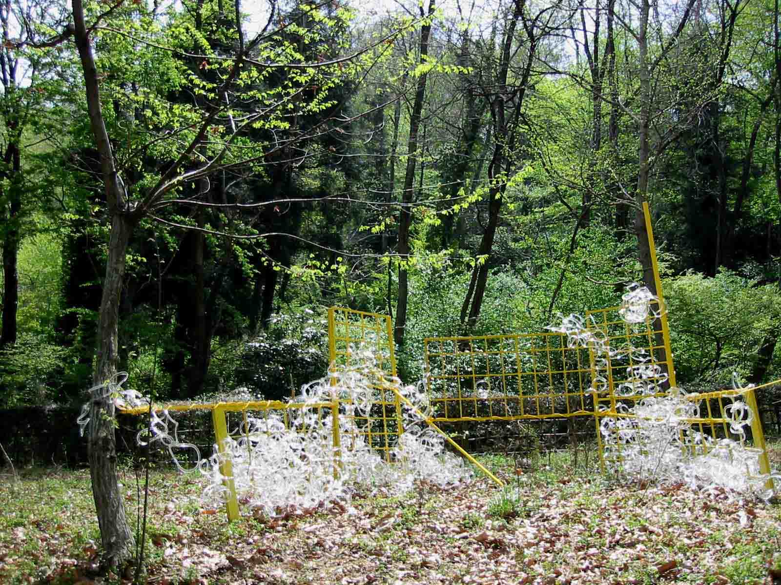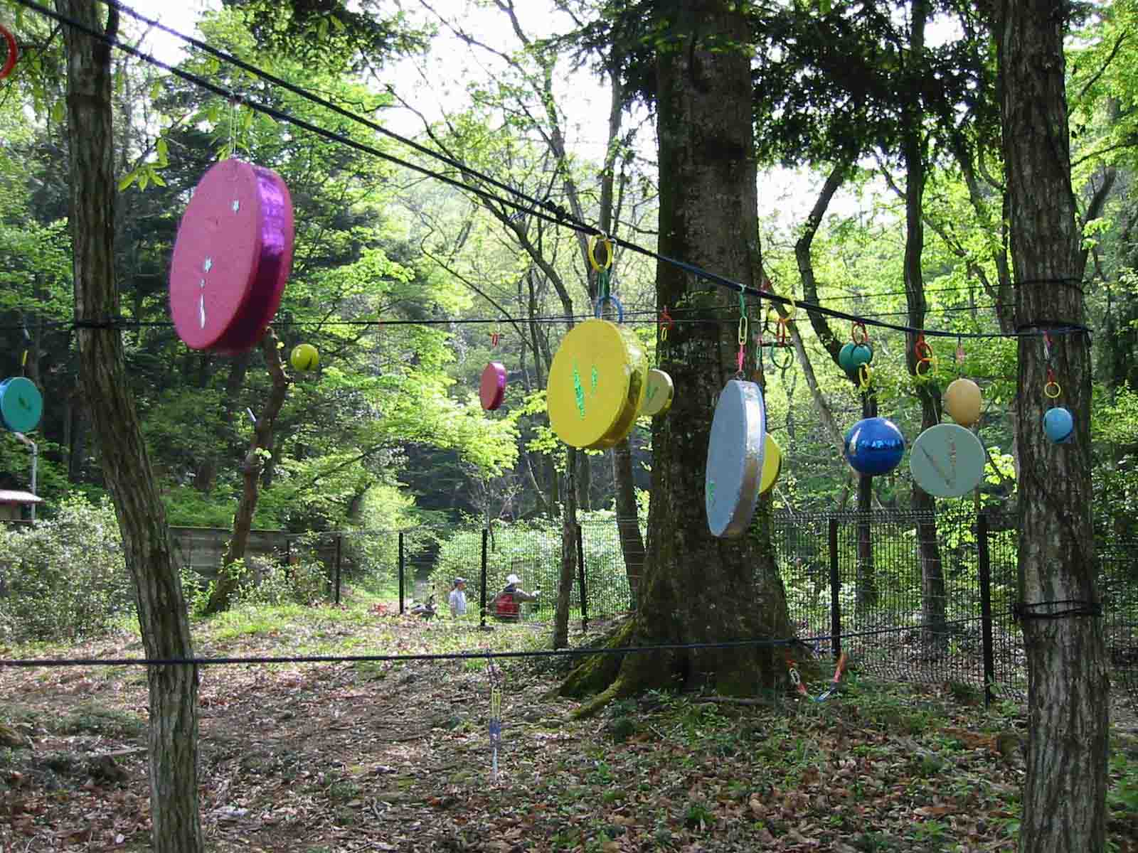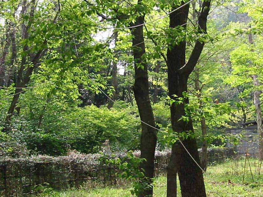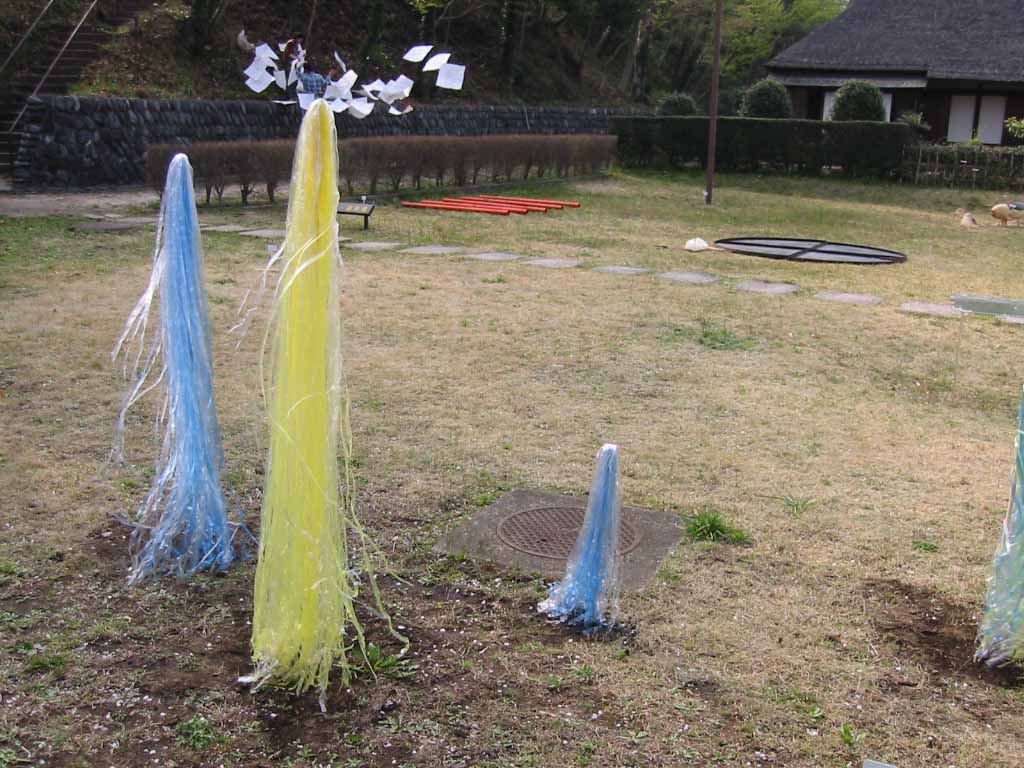 9島村 宗充野外習作・紐による空間の形成 ひもという簡素な素材を使い、既存の場所に対して、シンプルな関わりを持たせる事で、さりげなくも、だが、おもしろ味のある状態の空間を作り出せればと考えている。