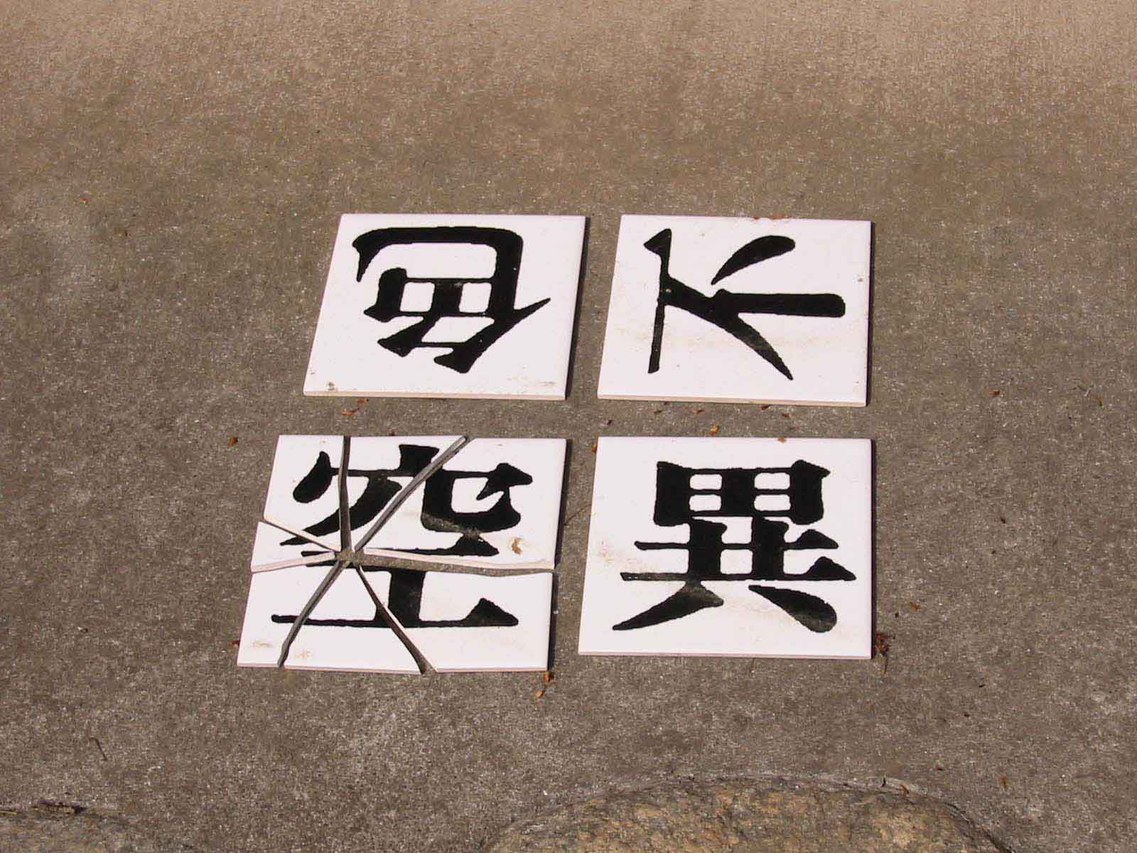 18望月 厚介変容する文字又は言葉タイル、シルクスクリーン漢字(経文)による美術。文字を読むのではなく文字を視る、文字をとりまく環境が漢字を異なる事物に変容させることを試みる