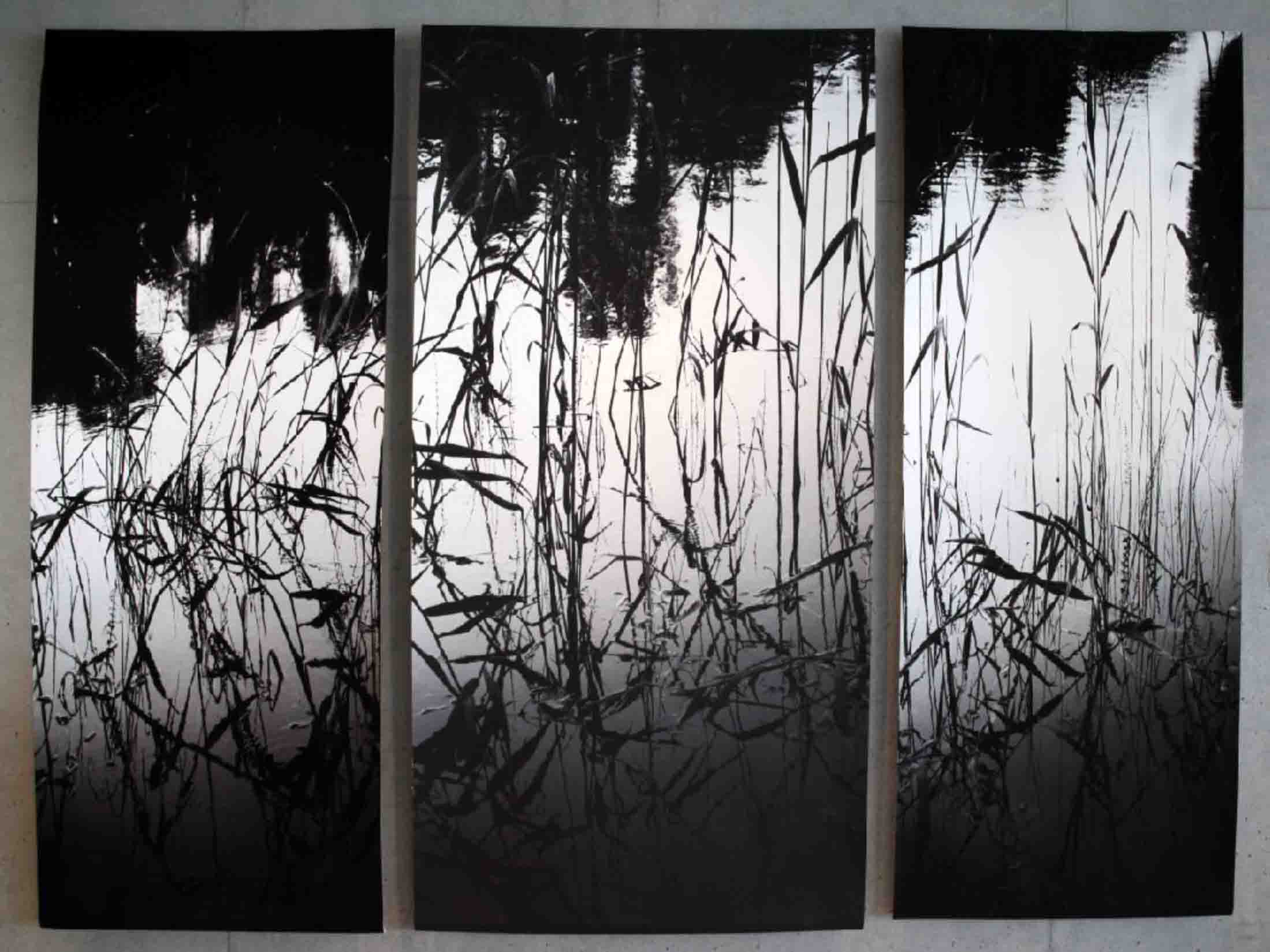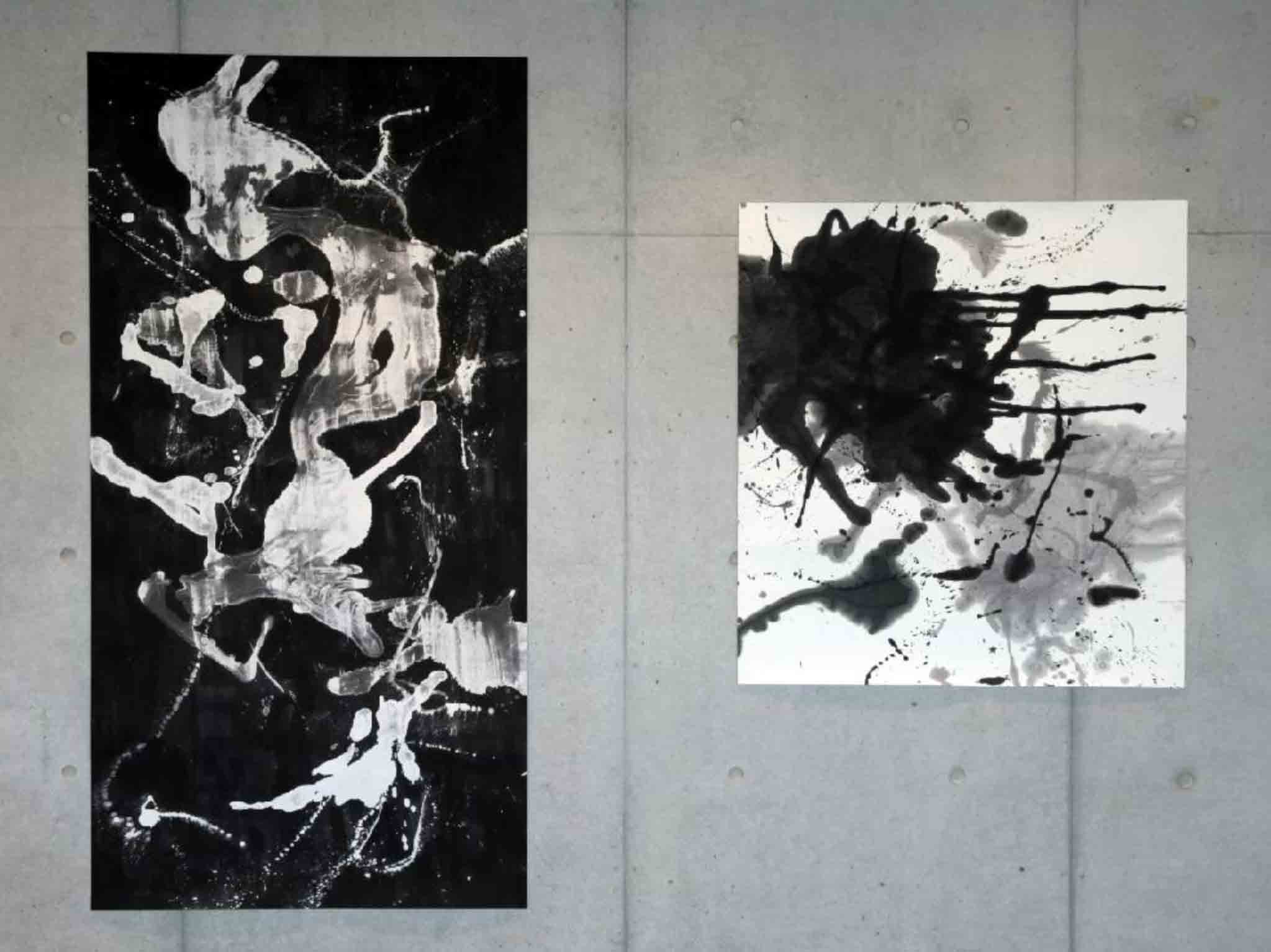 | 25 | 永田 典子 | そばに行けば | 墨 和紙 | 二枚で一つの作品である。これは滝壺から発想している。滝壺は垂直と水平がぶつかるエネルギーの磁場であるとともに、たゆたう場でもある。そこはネガであり、ポジであり、反転の場、そして浄化の場である。 |  |