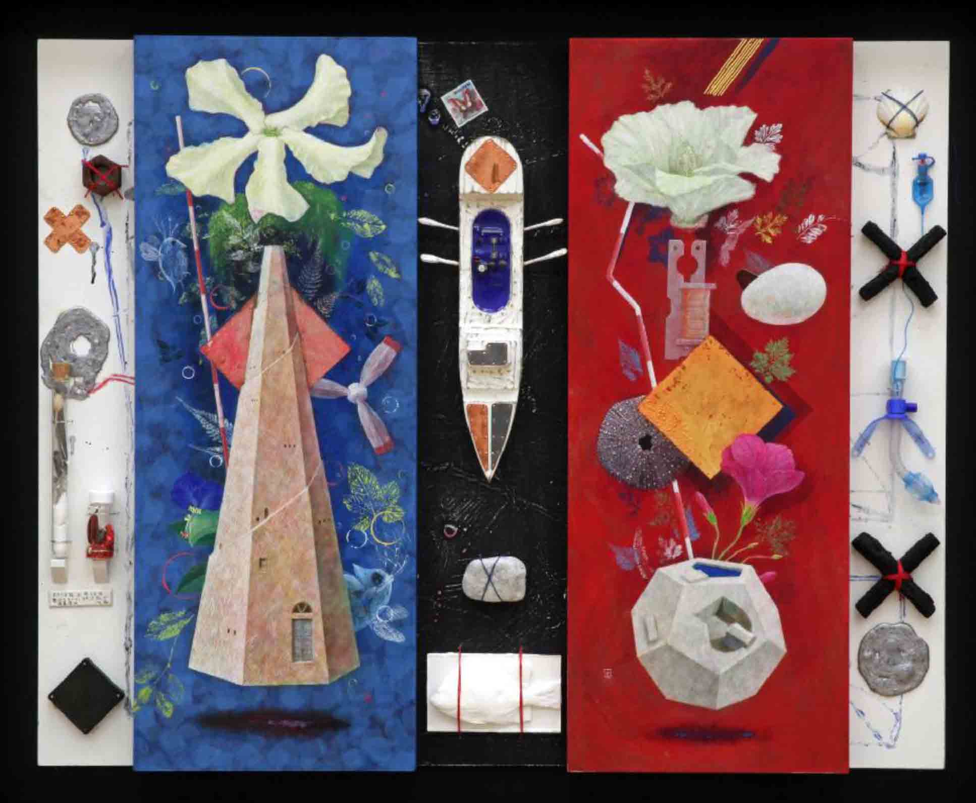| 12 | 佐藤 勤 | 動物・植物・鉱物 | テンペラ・油彩・ミクストメディア | 古代の人は世界中の物は生きて動く動物、動かない植物、生命のない鉱物の3つに属すると考えていました。そこで私は絵や立体物で世界のことを感じられる物語を作ってみました。 |  |