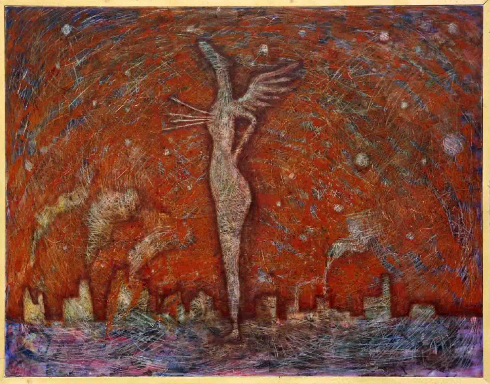 | 38 | 山口 通三 | 宙の箱 | キャンバス • アクリル絵具 | 宙に17人の子供を捜しに行くが、5人位は見付けたが変な箱が有るが、12人は今のところ不明です。 |  |