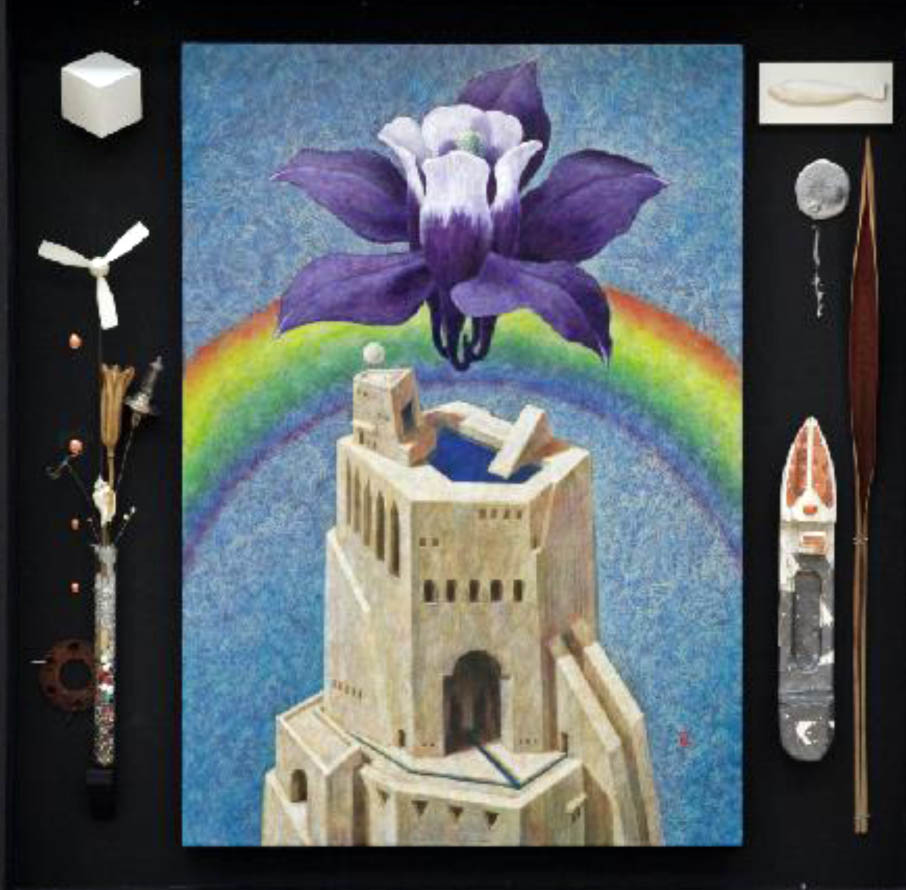 | 14 | 佐藤 勤 | 虹のかなた | テンペラ・油彩・ミクストメディア | 初夏の風にゆれるオダマキの不思議な形に魅せられた。キンポウゲ科に属するこの花の郷里は高い山だと言う、どうやってここまできたのだろうか。堂々と高い空を仰ぎ見る花は何を想っているのだろうか。 |  |