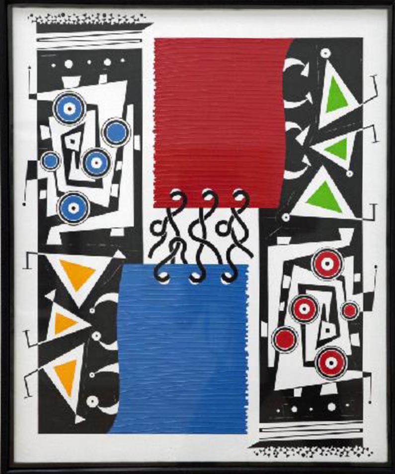 | 4 | 内田 信 | 「絆」 | 市販の色布、彩色、コラージュ | 現代美術家「色布に挑戦」展を3月に銀座の画廊で実施、集団では日本で初めてと自負しており、白を除く市販の布を使うことを条件とした。この時制作した作品の一点です。(未発表作) |  |