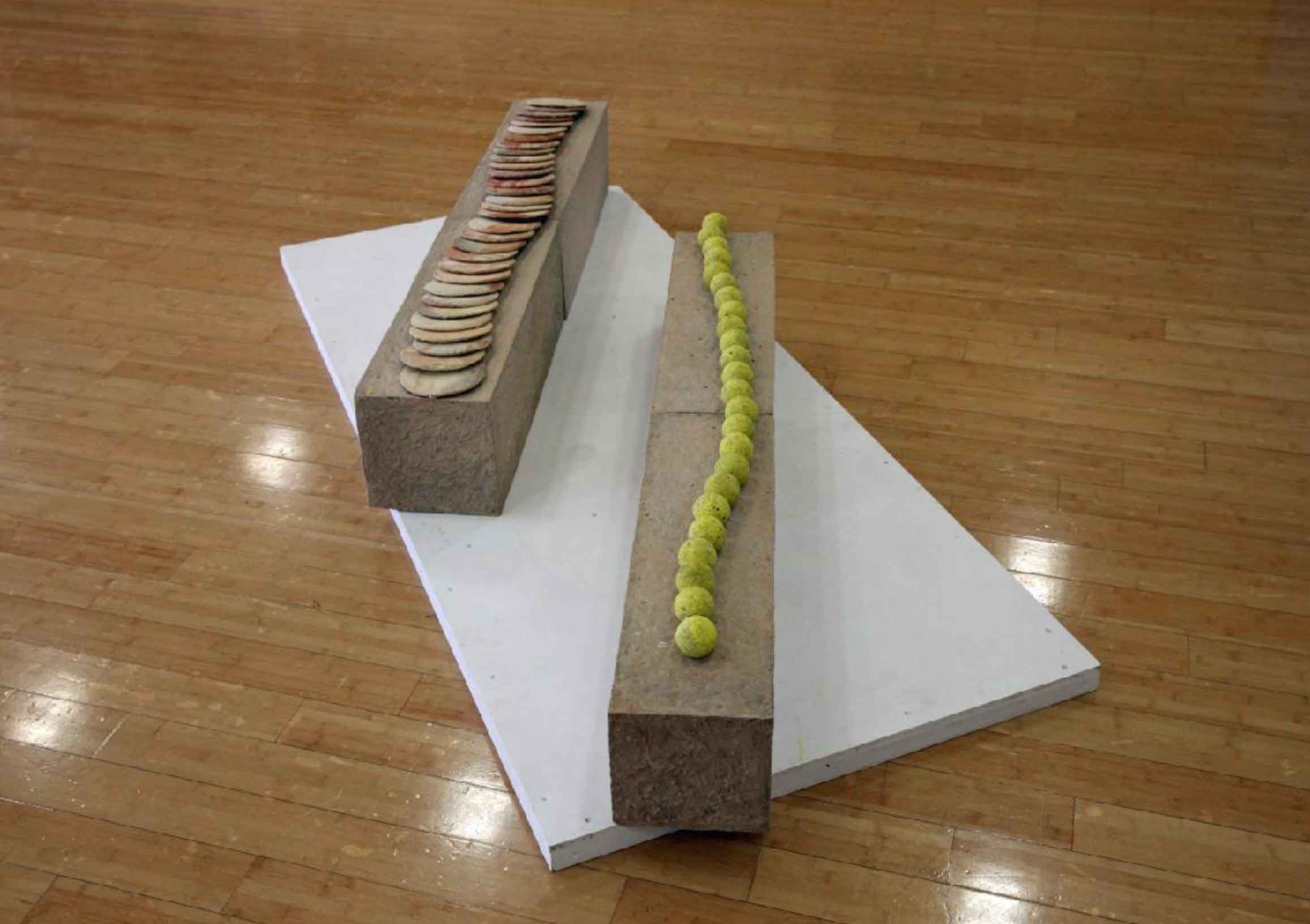 30原田 丕9月のマルメロアクリル、チョーク去年の9月の大雨の後、庭のブロック壁のすみに、青いマルメロの実がころがっていました。