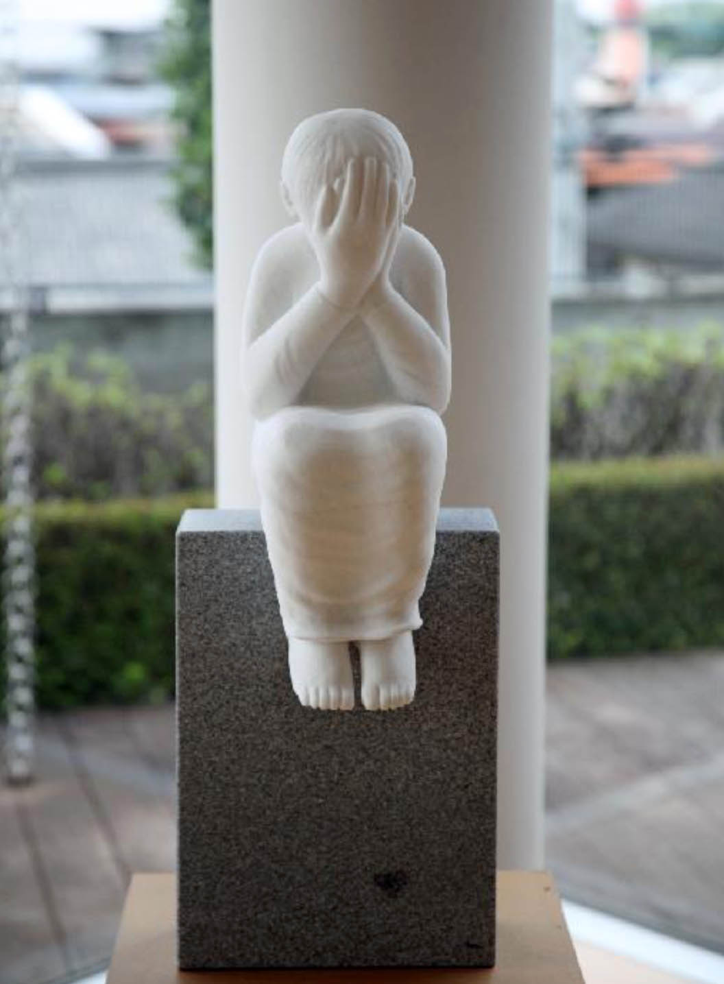 44渡辺 一宏『再生』白大理石悲嘆に暮れるのではなく、立ち上がり動き出すその一瞬前の躊躇いの姿態を表現してみたいと思い、形象化してみました。