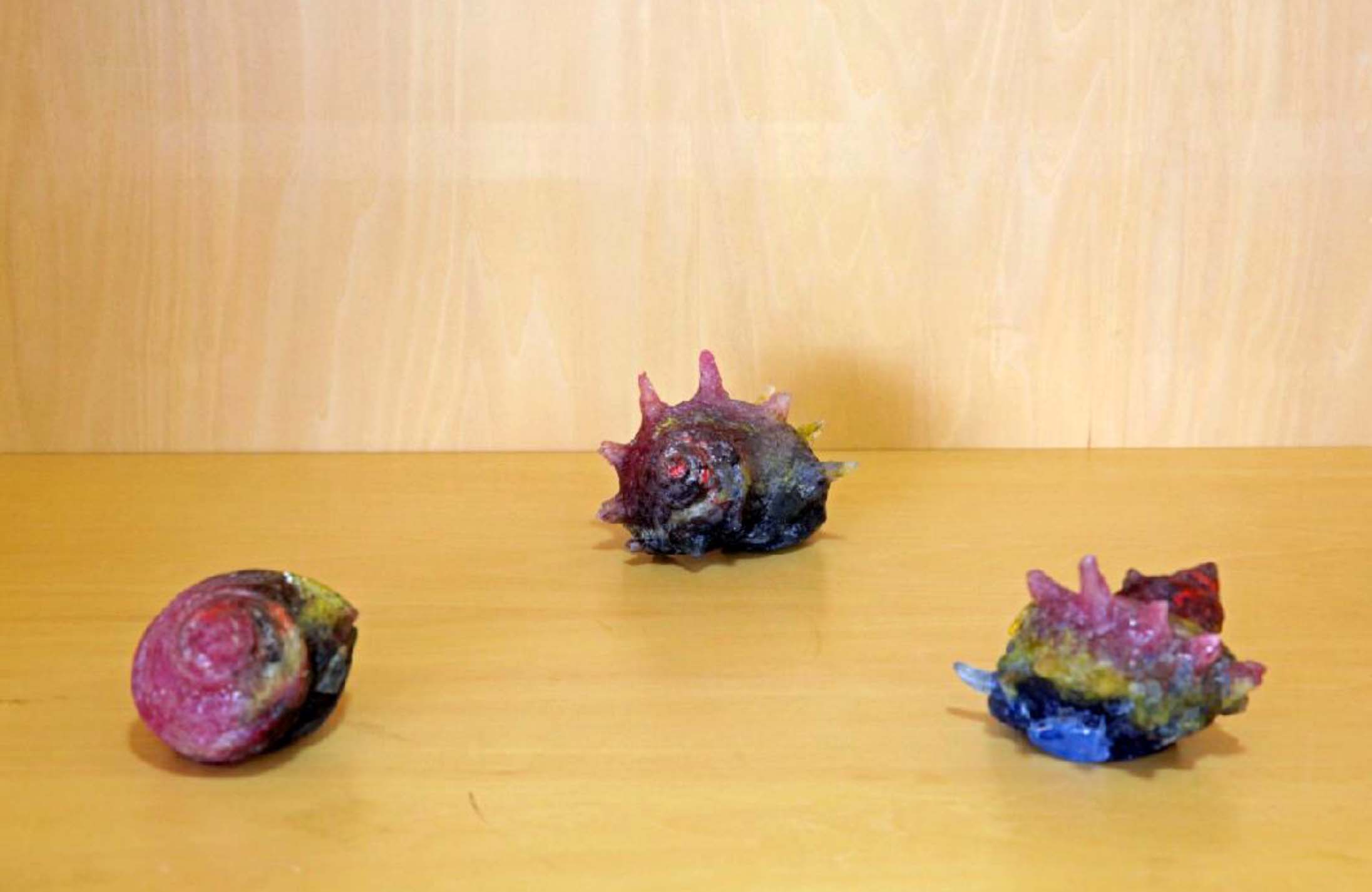13坂口 啓子ガラスのサザエガラス高幡不動から伊豆大島へ移り6年がたちました。住んでいる所は、意識をこえ作品に影響を およぼします。さざえをたくさん作るようになりました。