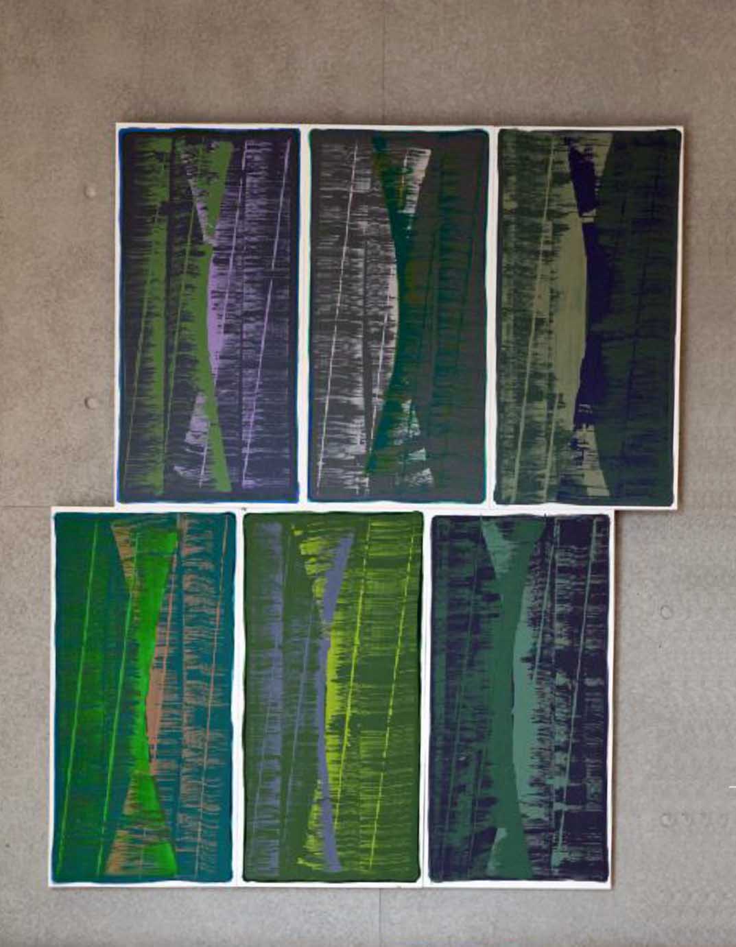 8片山 憲二樹木1401(木版)和紙、アクリル版木5枚程度、色数5色ぐらいを和紙に何十回と版を重ねて摺った木版画です。樹木のイメージを表現したいと思っています。