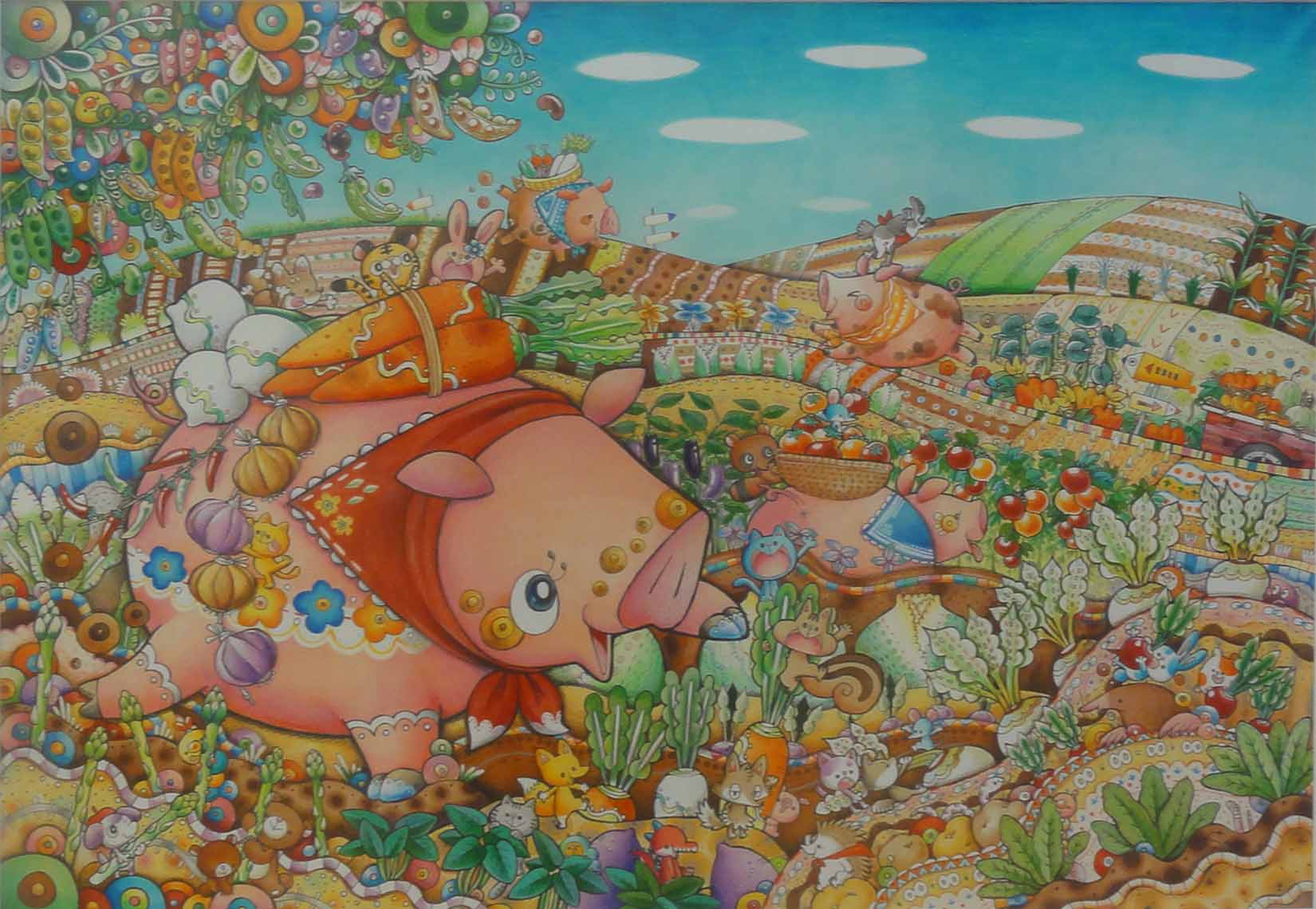 ひろい青空の下、たくさんの野菜を育てているブタさん家族。どの野菜もおひさまを浴びてとっても美味しいよ。野菜が苦手なこども達もモリモリ食べれるよ。