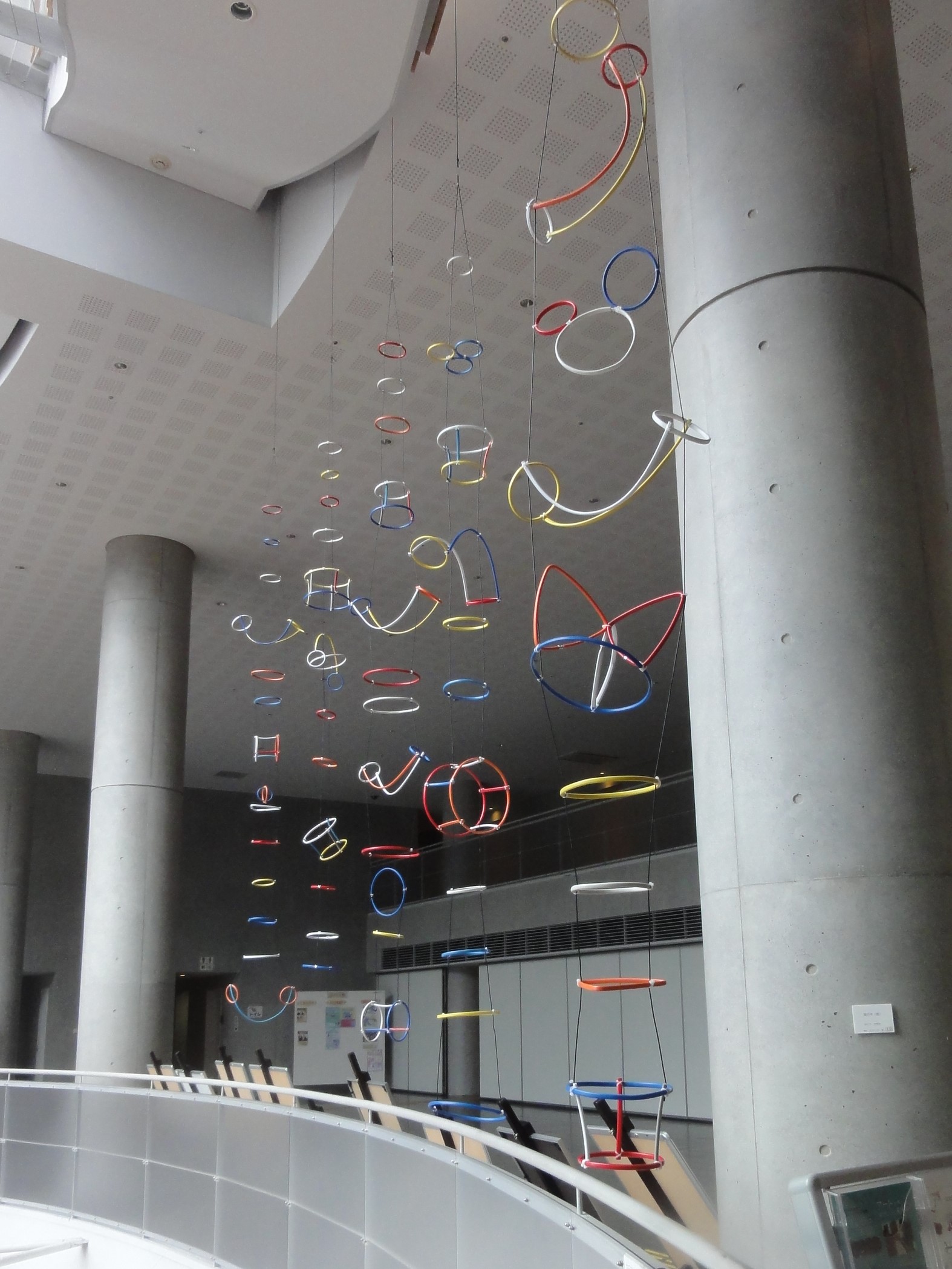 天井や壁の裏になる電線ケーブルを使い立体を作っています。吊り提げたり張りつけたり置いたりと。カラフルなケーブルはまるでヨーカイが遊んでいるようです。