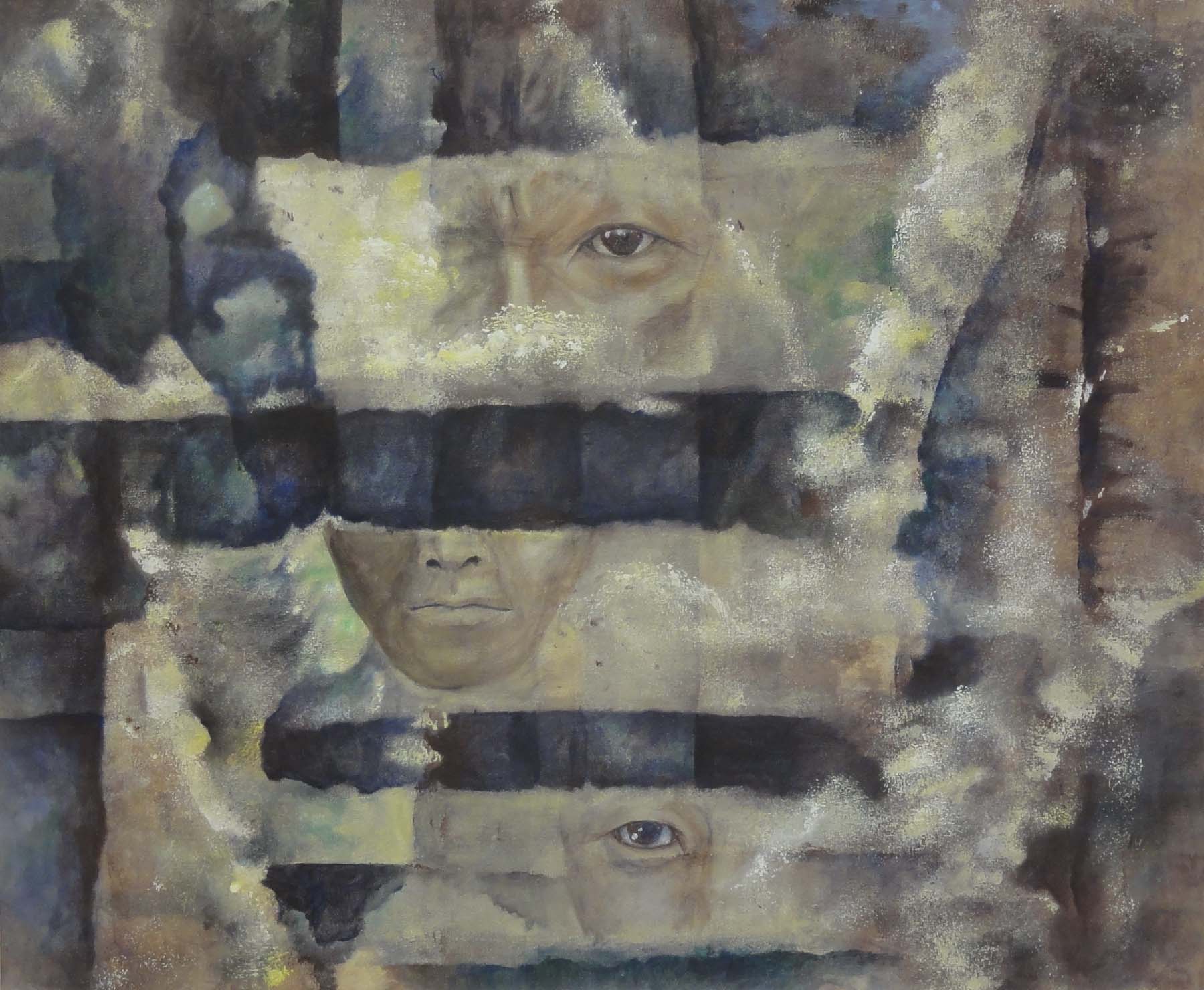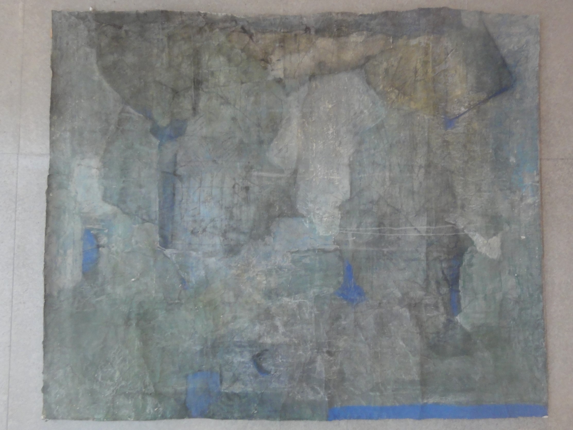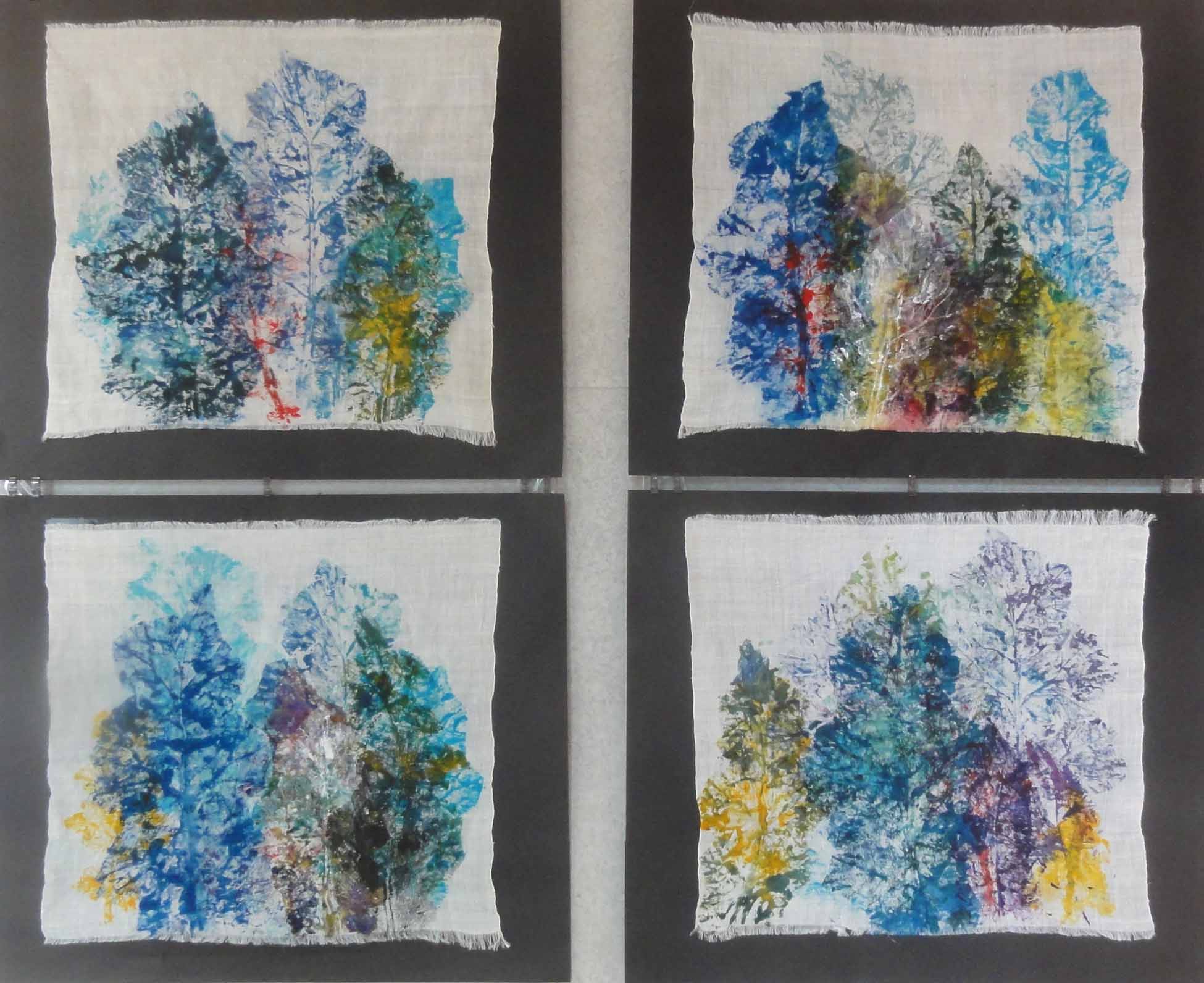 7片山 憲二樹林の想い-5(木版)和紙、アクリル和紙に何十回と刷っているともっと表現方法があるのではないかと思い、表面を削ったり裏からの染み込んだ色で発表したり、他の和紙を貼ったりしちる木版画です。
