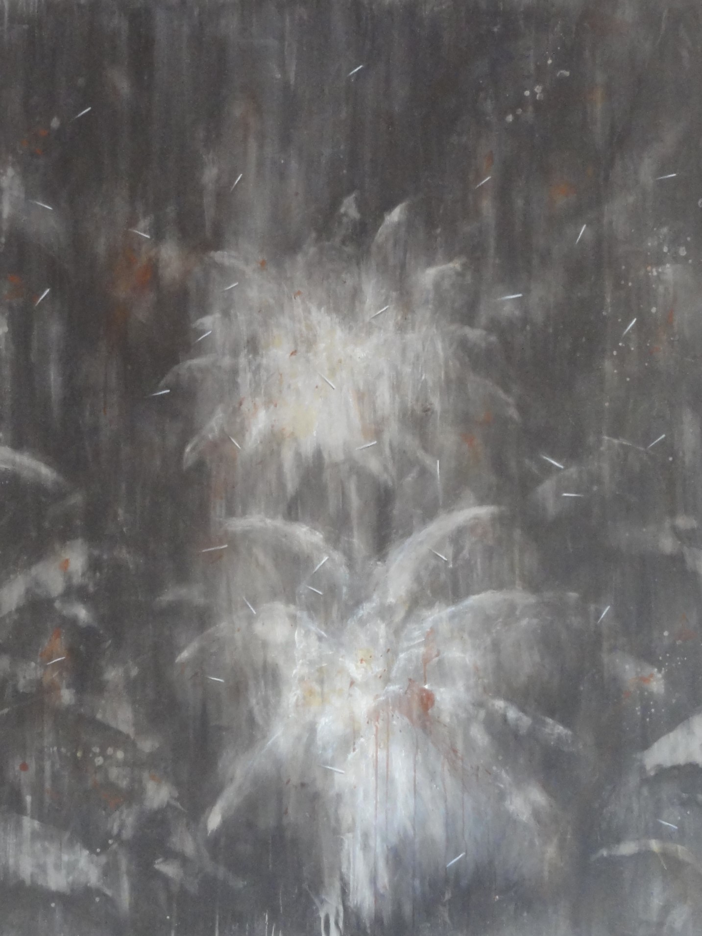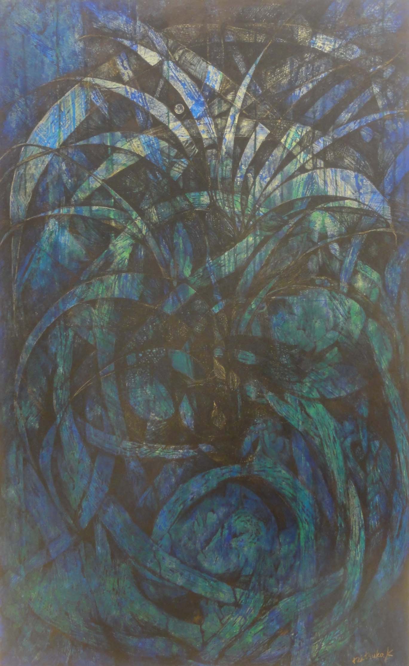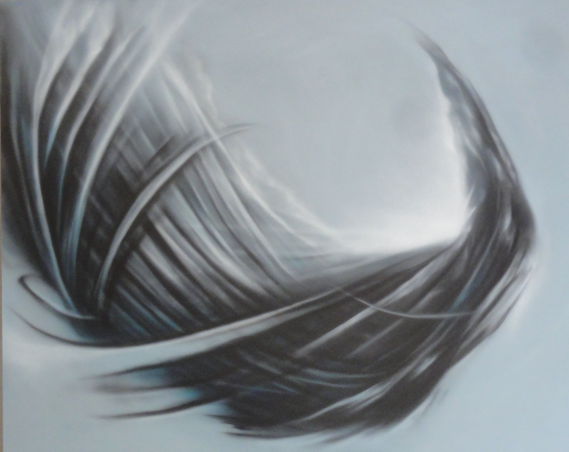 22硯川 秀人螺旋の今アクリル絵具、キャンパスエアーブラシでアクリル絵具を水で溶いて吹き付けて表現しています。描いているものは空気の動き(風)かな。雲からのぞく光にとても感動を受け、今回の作品になりました。