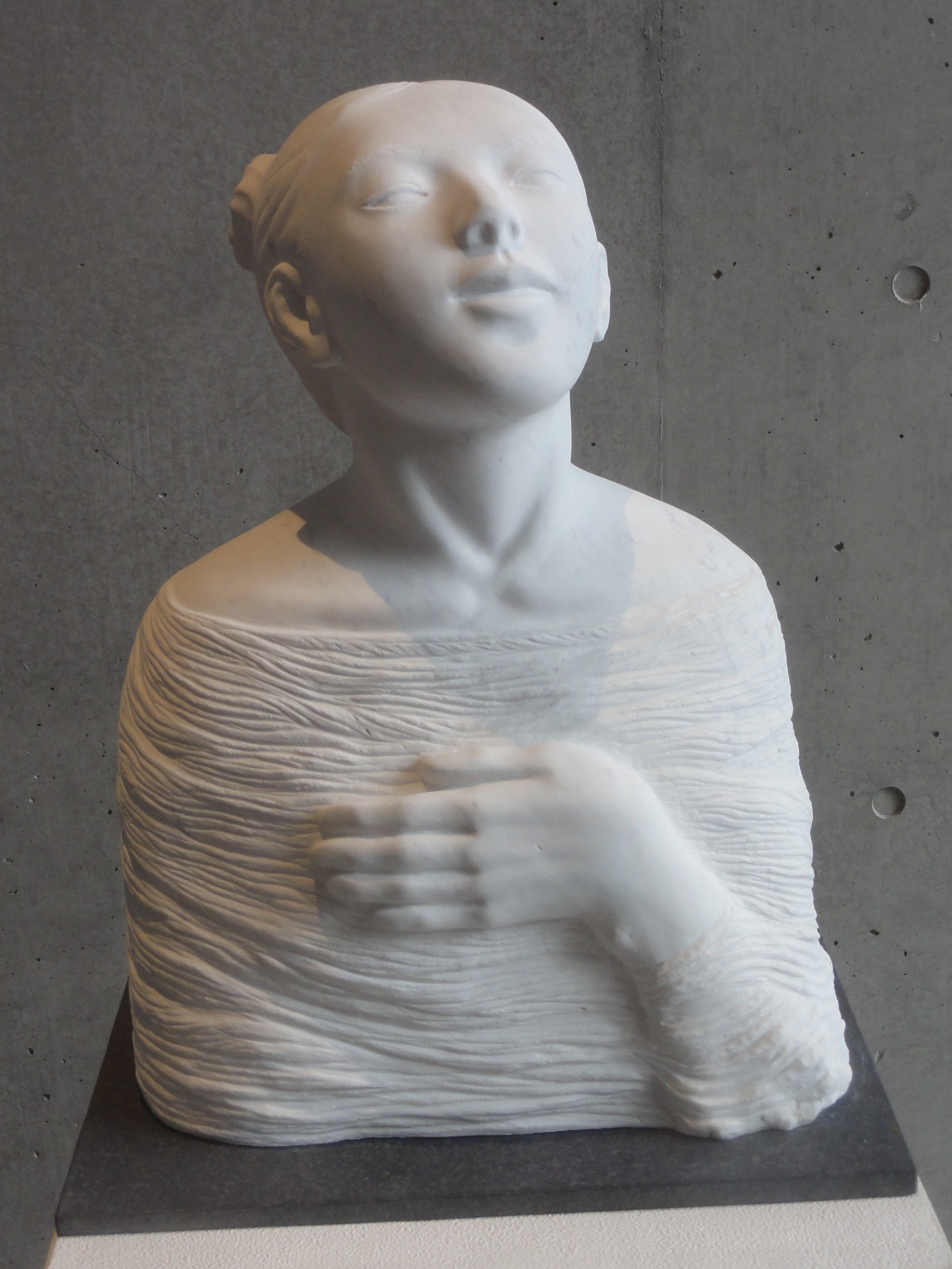 54渡辺 一宏『遥・HARUKA』白大理石「最近感じたことは、あまりにも石のことを知らない人達が多いことに気付いたこと。少しでも石や石彫のことを知ることで、より身近に楽しんで貰えればと思う。」