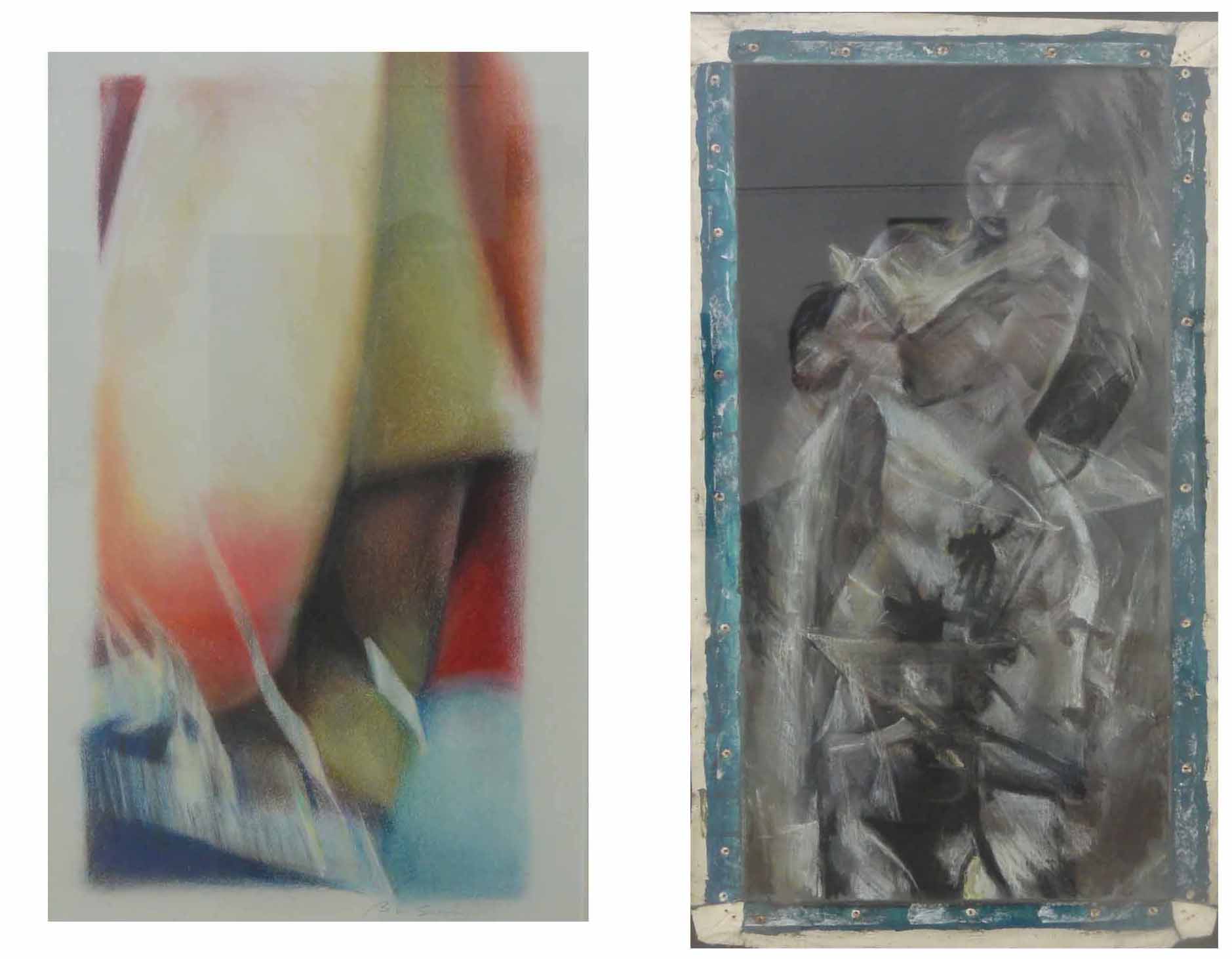 52山﨑 康譽「白い街 Ⅰ」「白い街 Ⅱ」キャンバスにアクリル、油彩等「東京新宿で育った私は、幼い頃より人工物に囲まれた生活をしていました。歳を重ねるとともに、それらの記憶がイメージの中に浮かび、画面に表れてきました。」