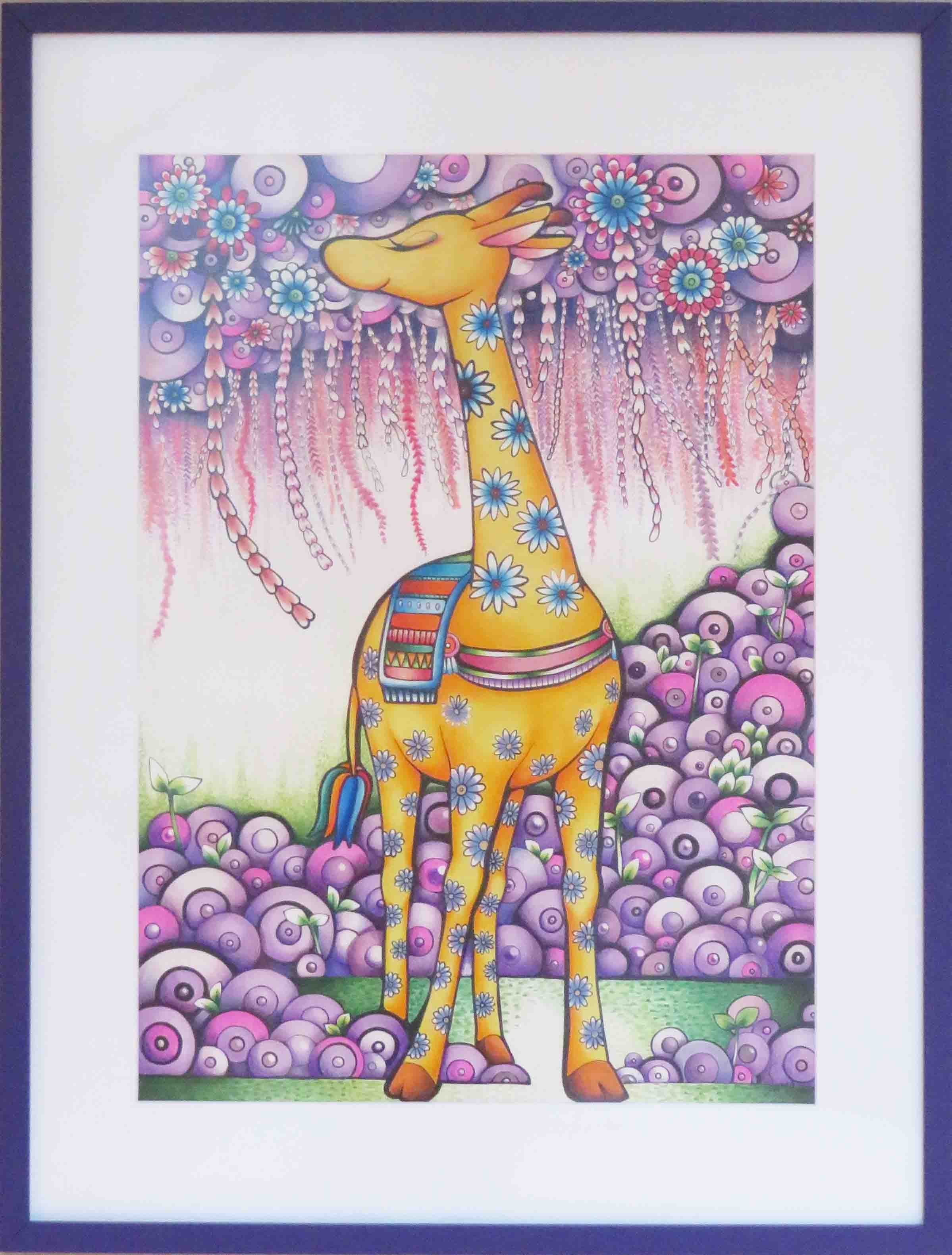 22SANA風紫~ふじ~カラーペン、色鉛筆藤の花が春の風にゆれる静かな森の中、キリンさんはゆっくりと散歩をしています。あなたはどんな風が好きですか?