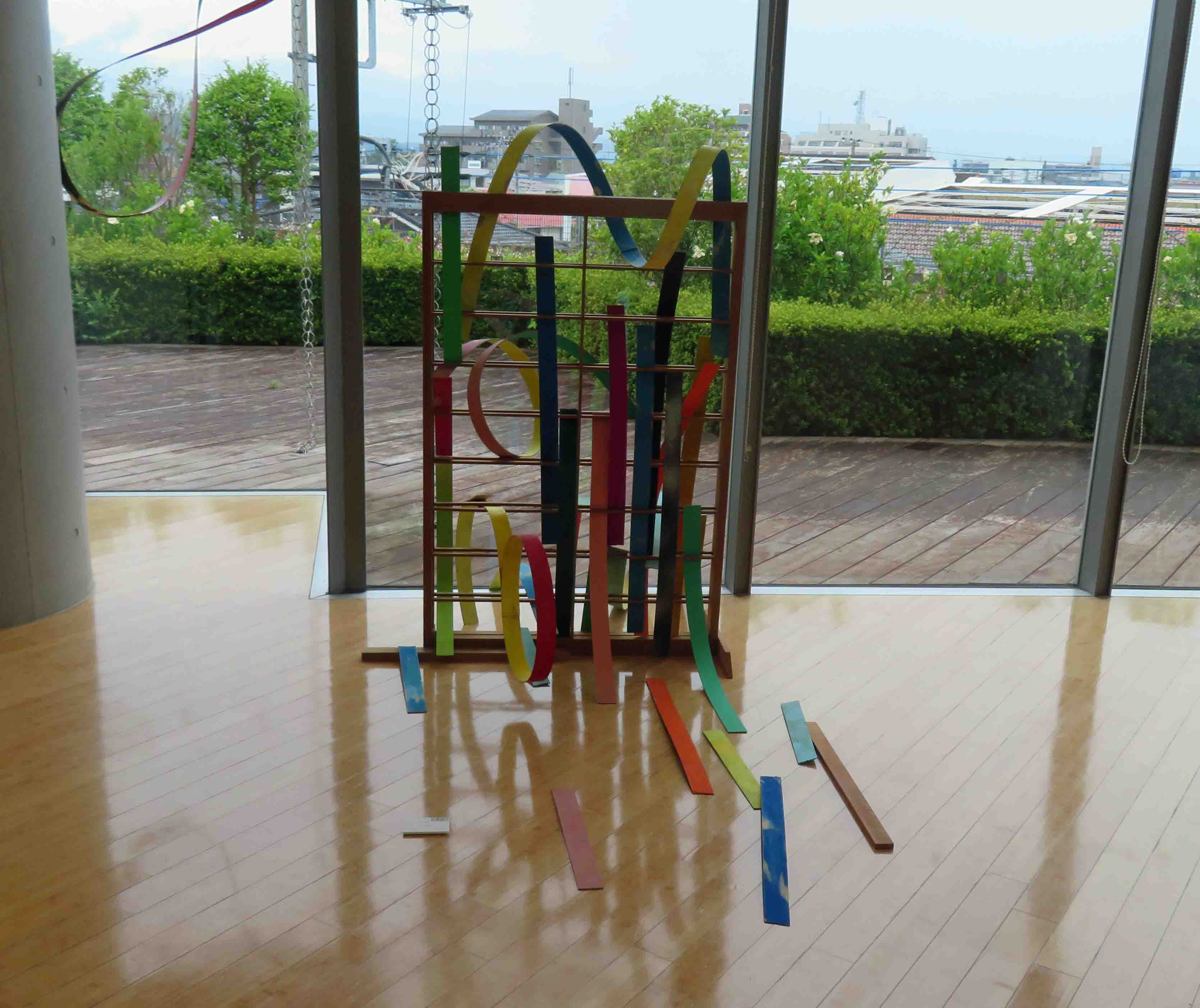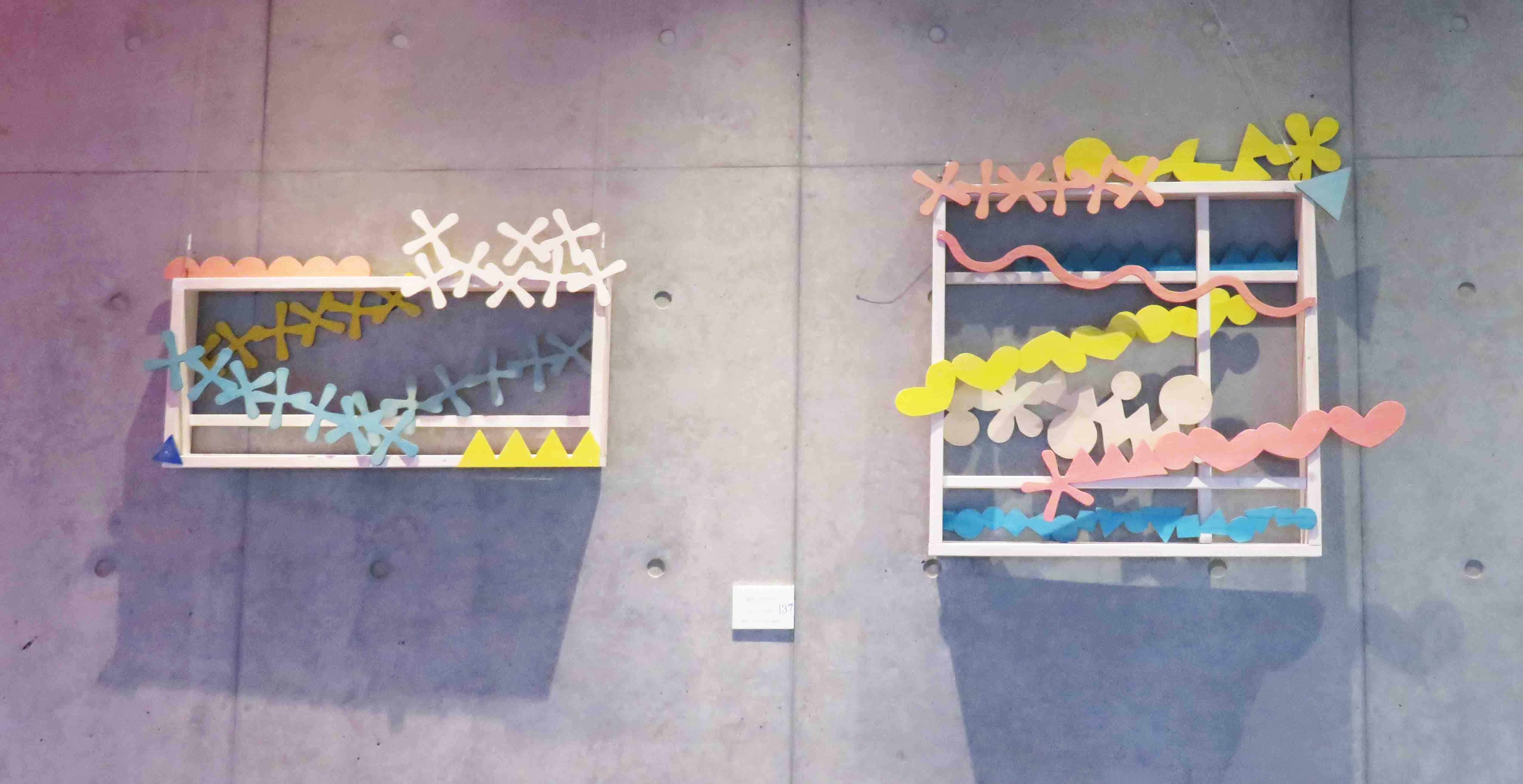40永田 典子無題障子枠 MDFボード アクリル絵具 ペンキ絵でも彫刻でもない形。障子は挟まれた色の帯のしなりでガラスの前に立つ。光は色、色は命。裏も表もつながる空間。