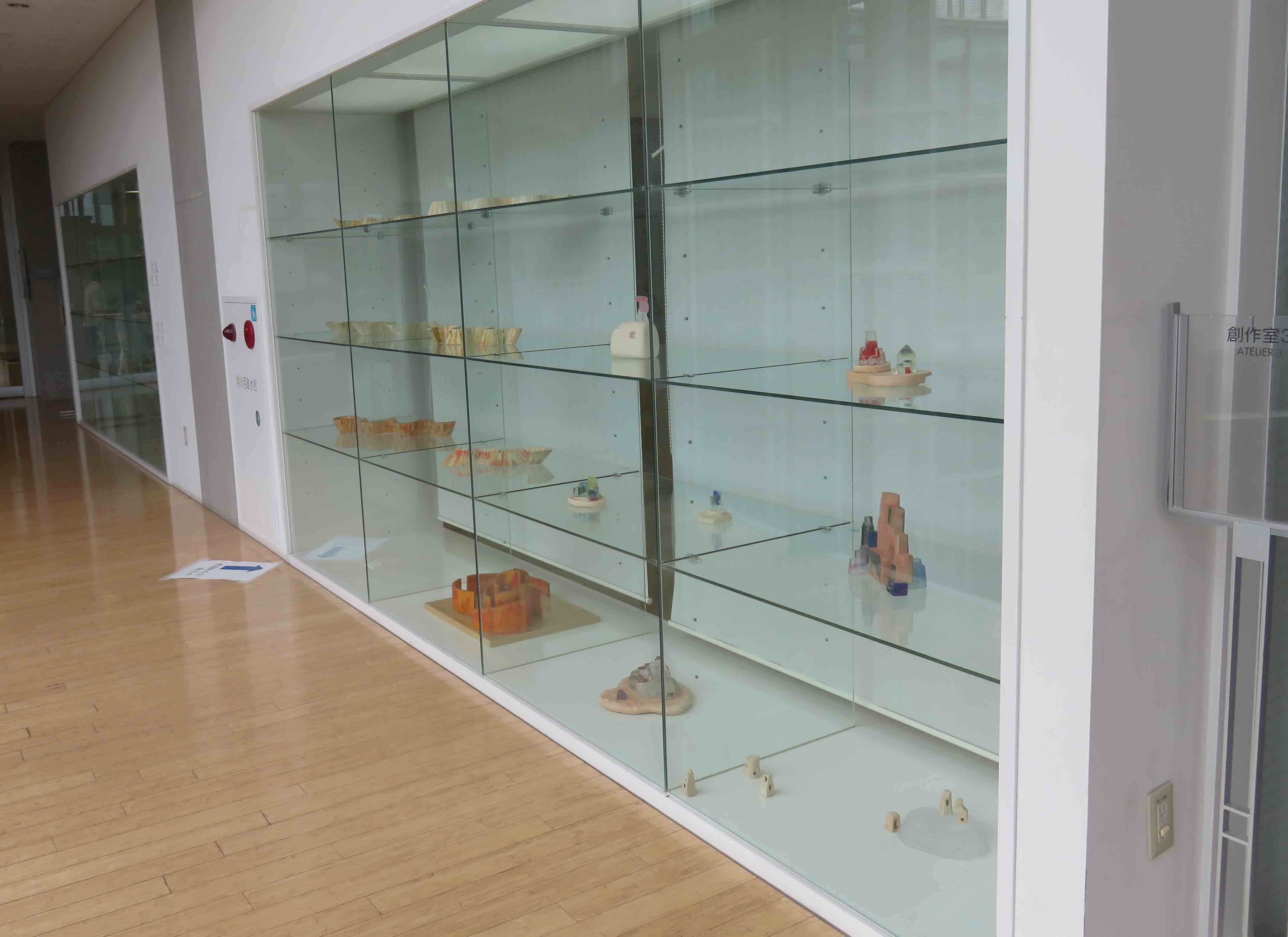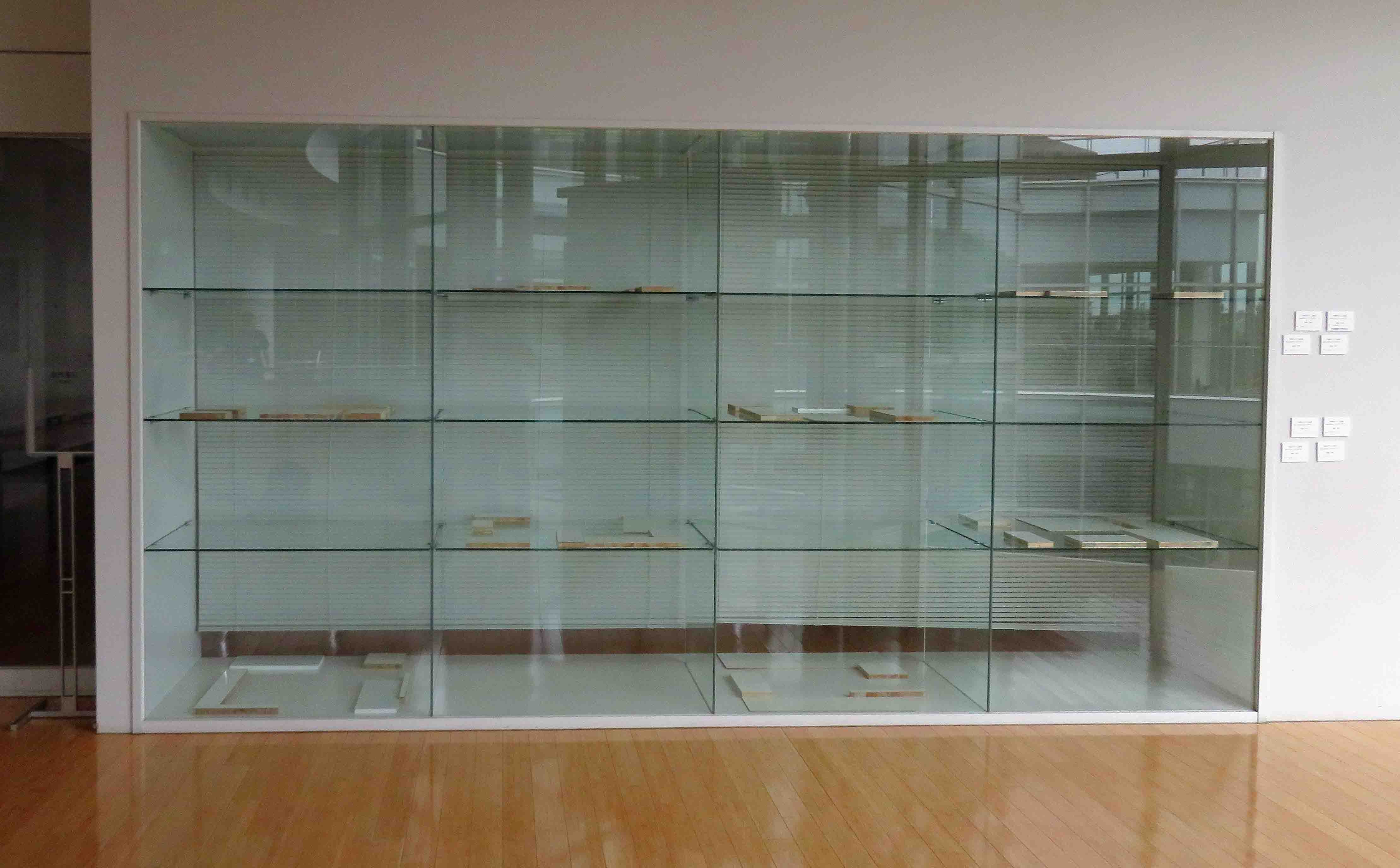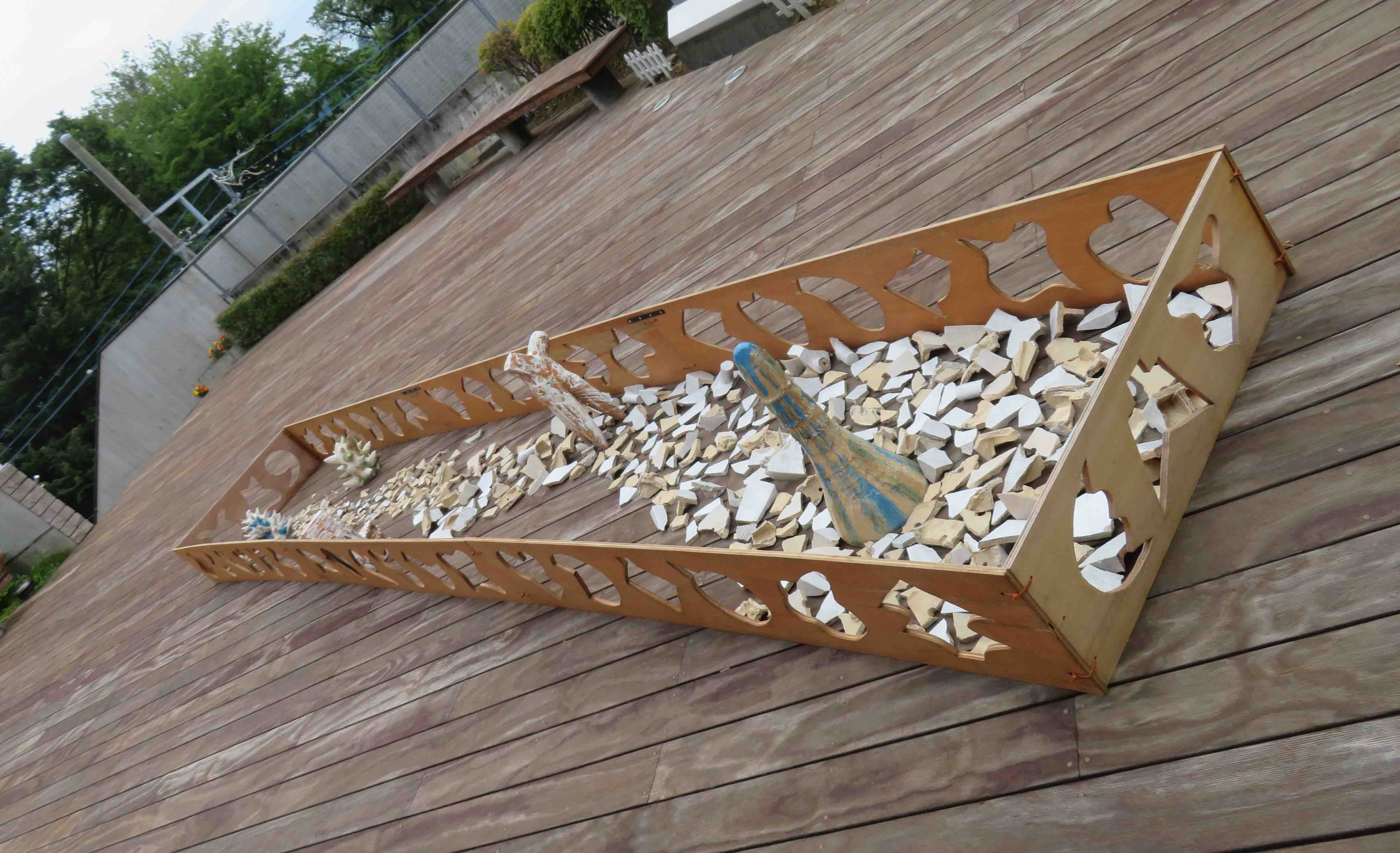 6伊藤 タダオ記号とオブジェセラミック、合板合板8枚に型ぬきをした。型は記号を表しているが、どんな記号か…?その8枚をつないで直方体にして、中にはオブジェの庭を。