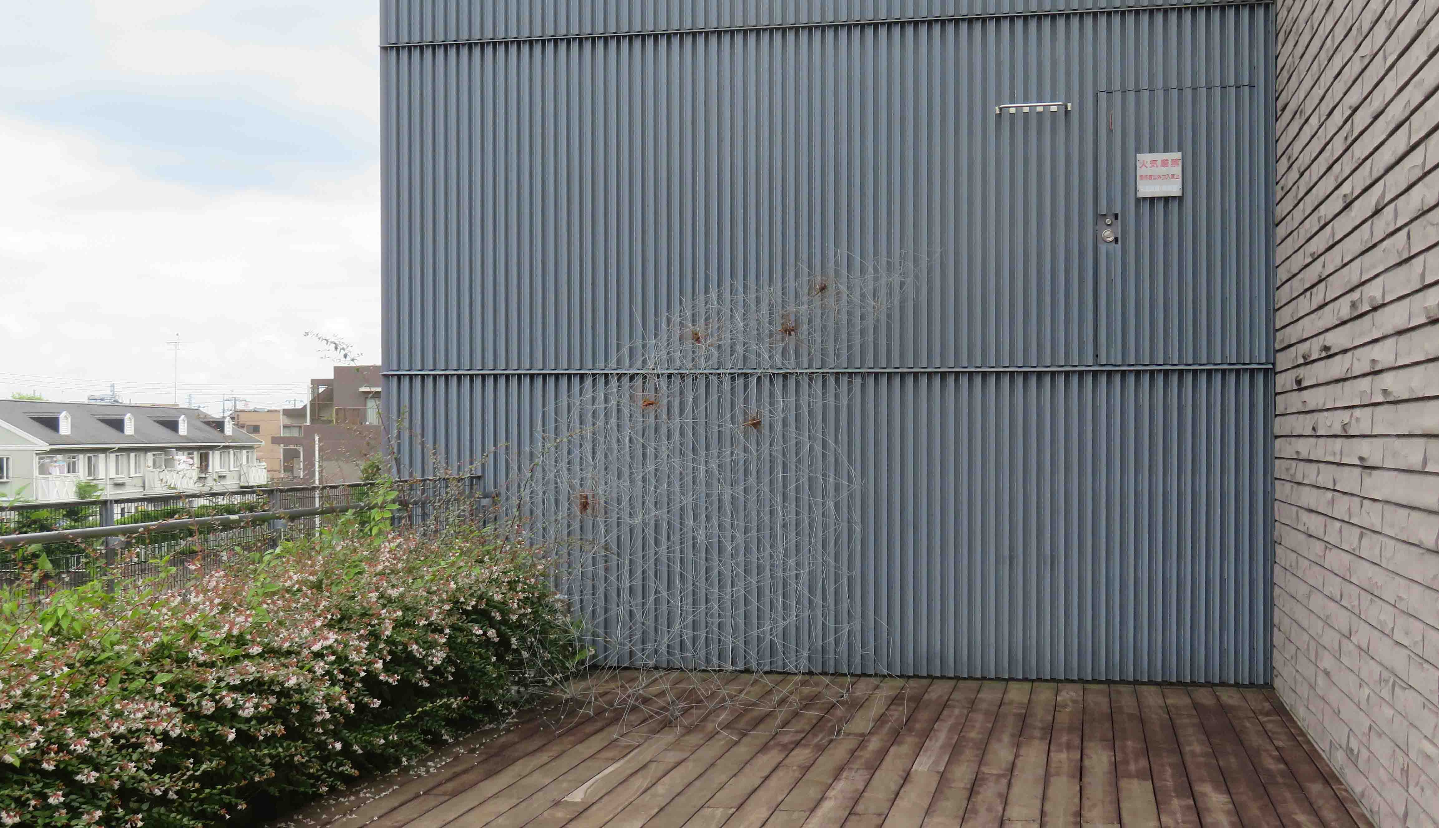 54Mizzy蓮尾a Piece of Nature布 糸 ワイヤー上には青い空、下には青々とした草。当然のように立ち当然のように生きている。37兆個の細胞に突き動かされ私は青い地球で今を生きる。