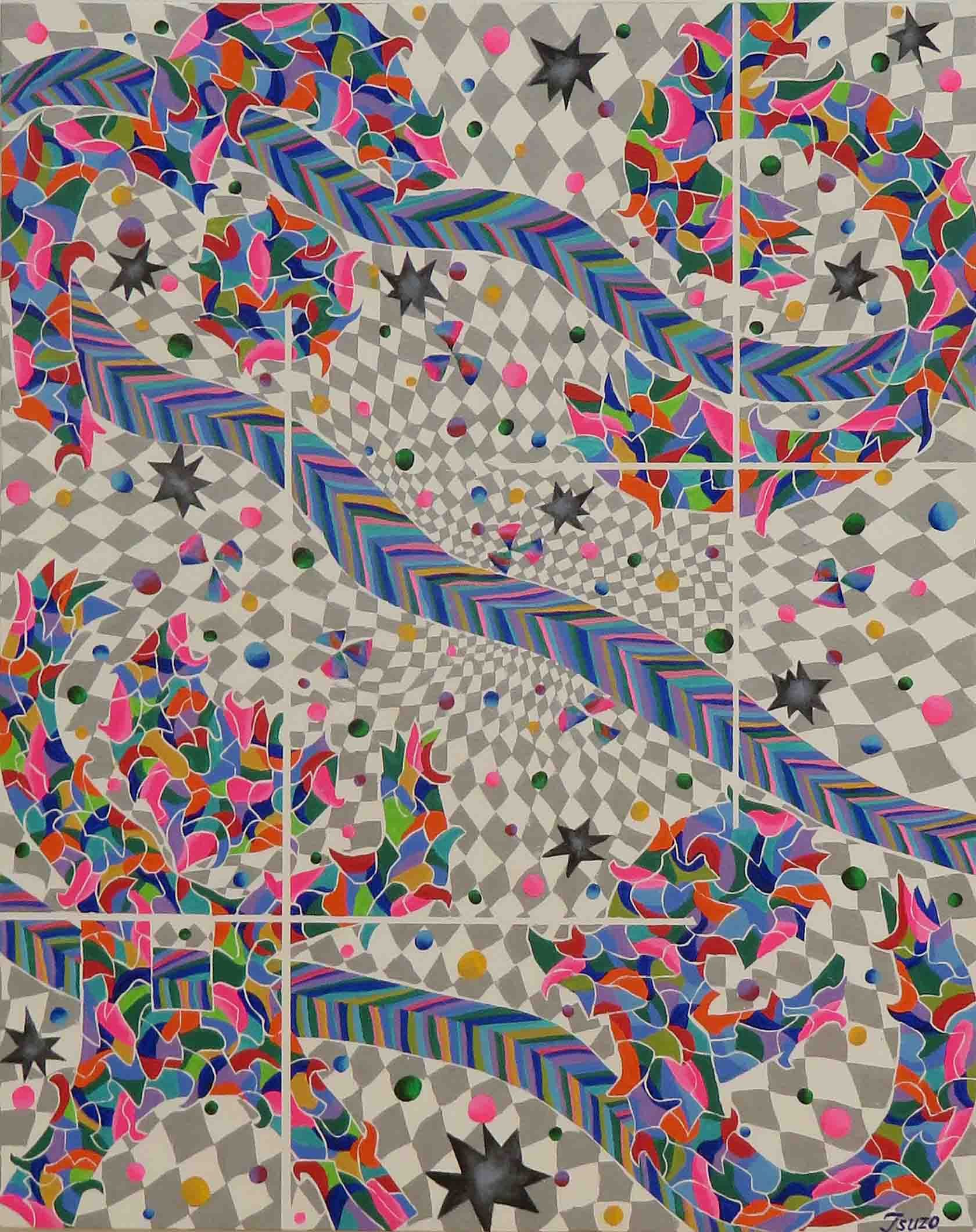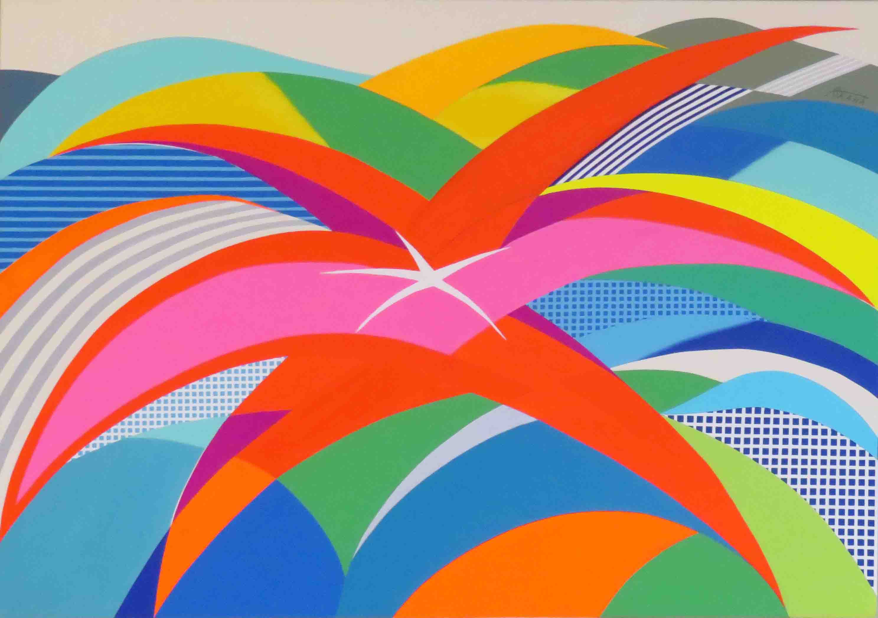 15金森 昭憲Brightnessキャンバスにアクリル絵具現代的な色彩について追求している。人工的な『輝き』を意識して制作を続けている。今回は生命を連想させる曲線を多く取り入れた。