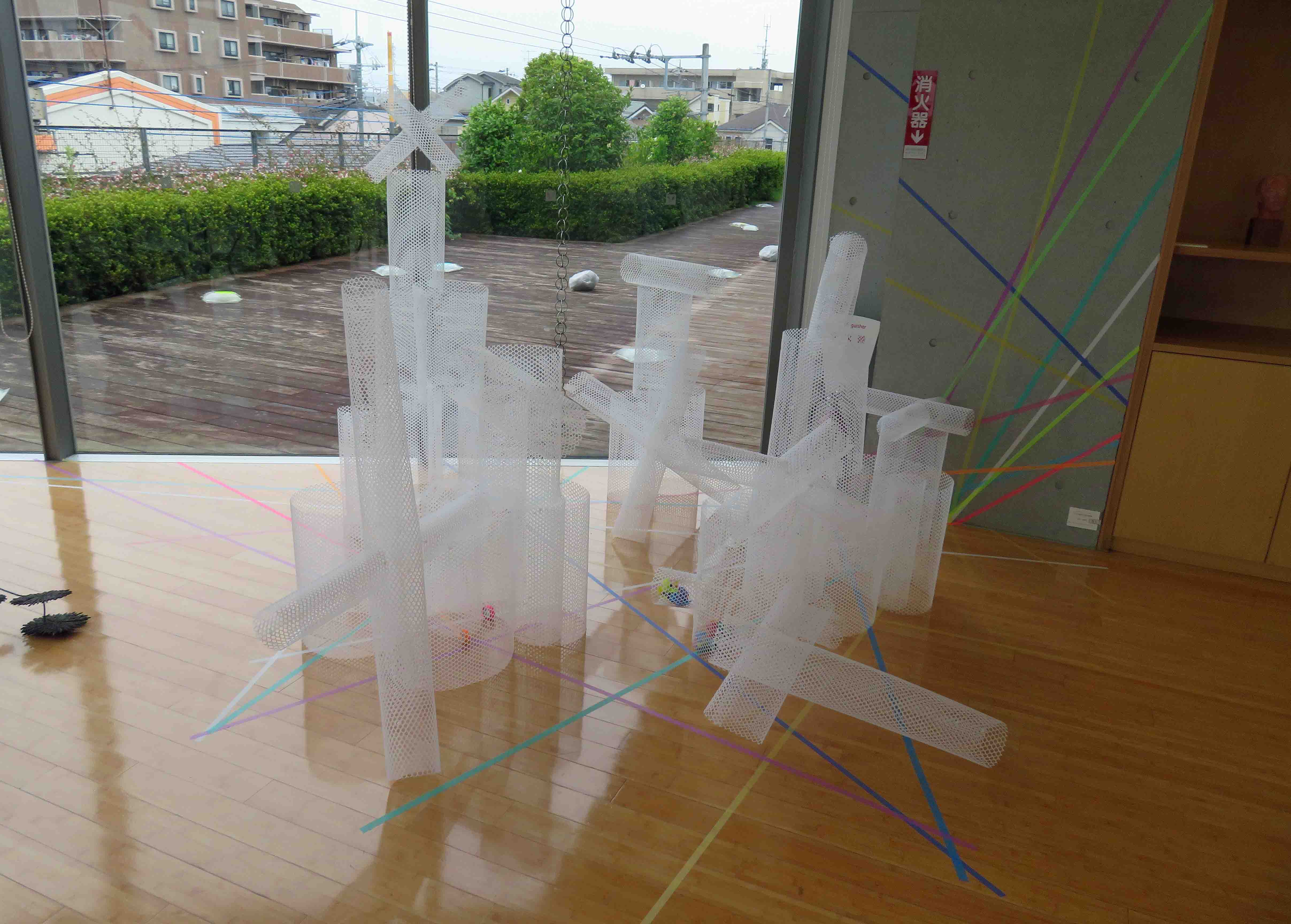 1ARTーSHO風の花嫁布、金属枠、ポリエチレンシートなど風が吹き抜ける。場に、色合いがあるように、風にも〔あわい〕色を感じる。光と踊る風。花嫁のように幸せそうだ。