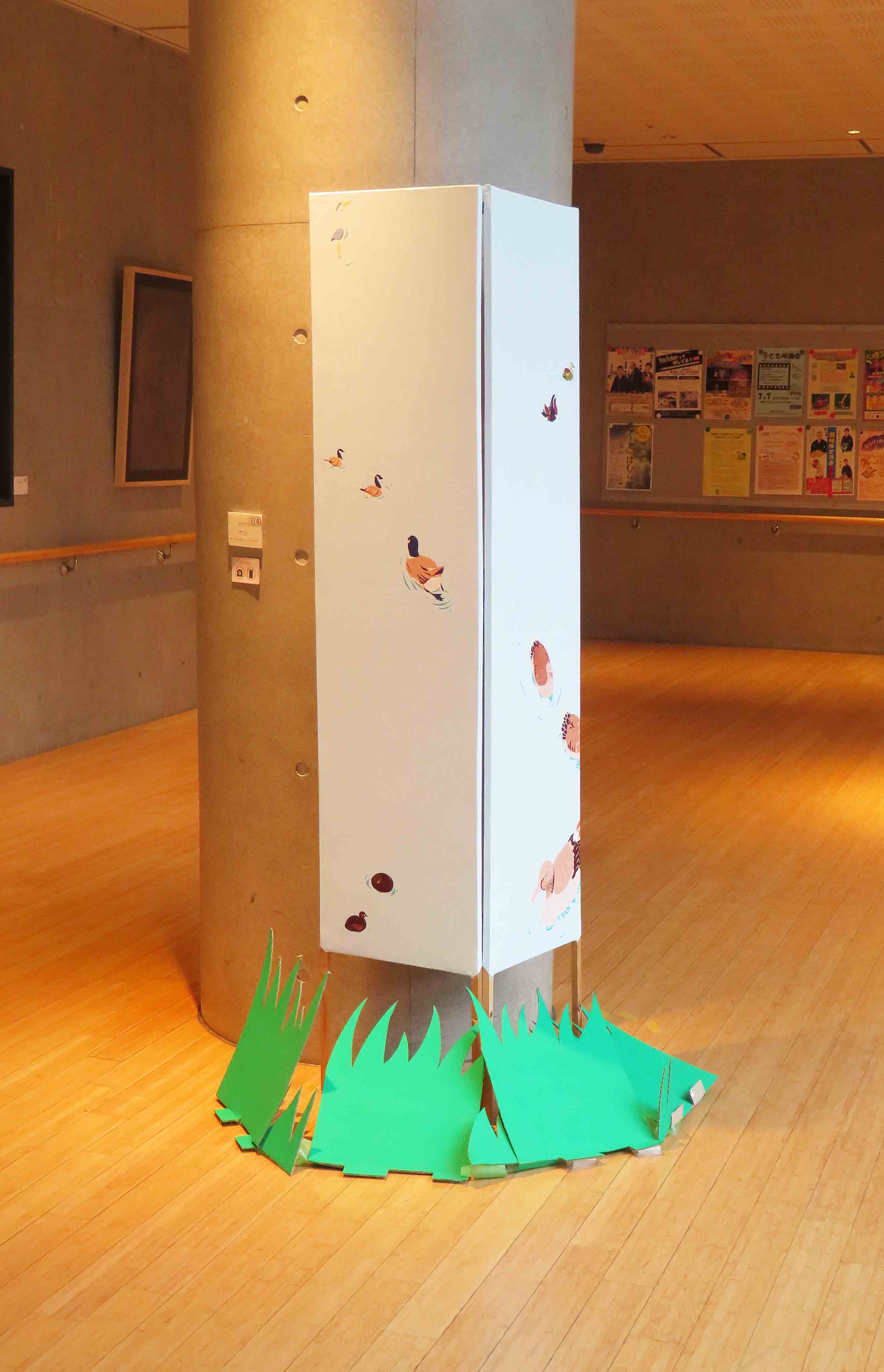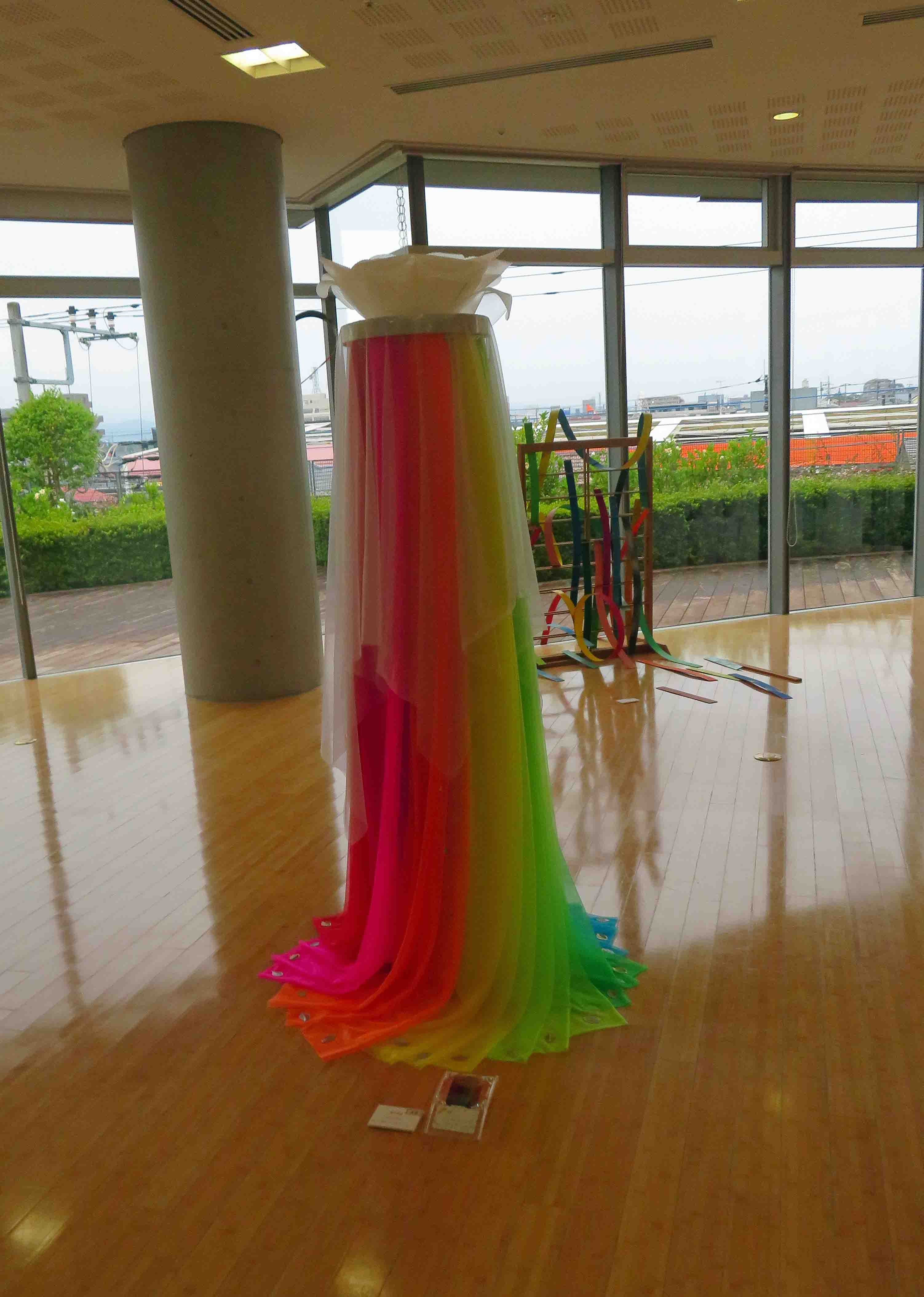 17貴俵 秀行鑑賞者のためのインスタレーションPPバンド、鏡、LED、ほか毎年行われているアートinはむらですが、去年まだまだ開催を知らない方がいましたのでもう少し知ってもらうために1階フロアに設置したいと考えました。今年はどうなるかな。