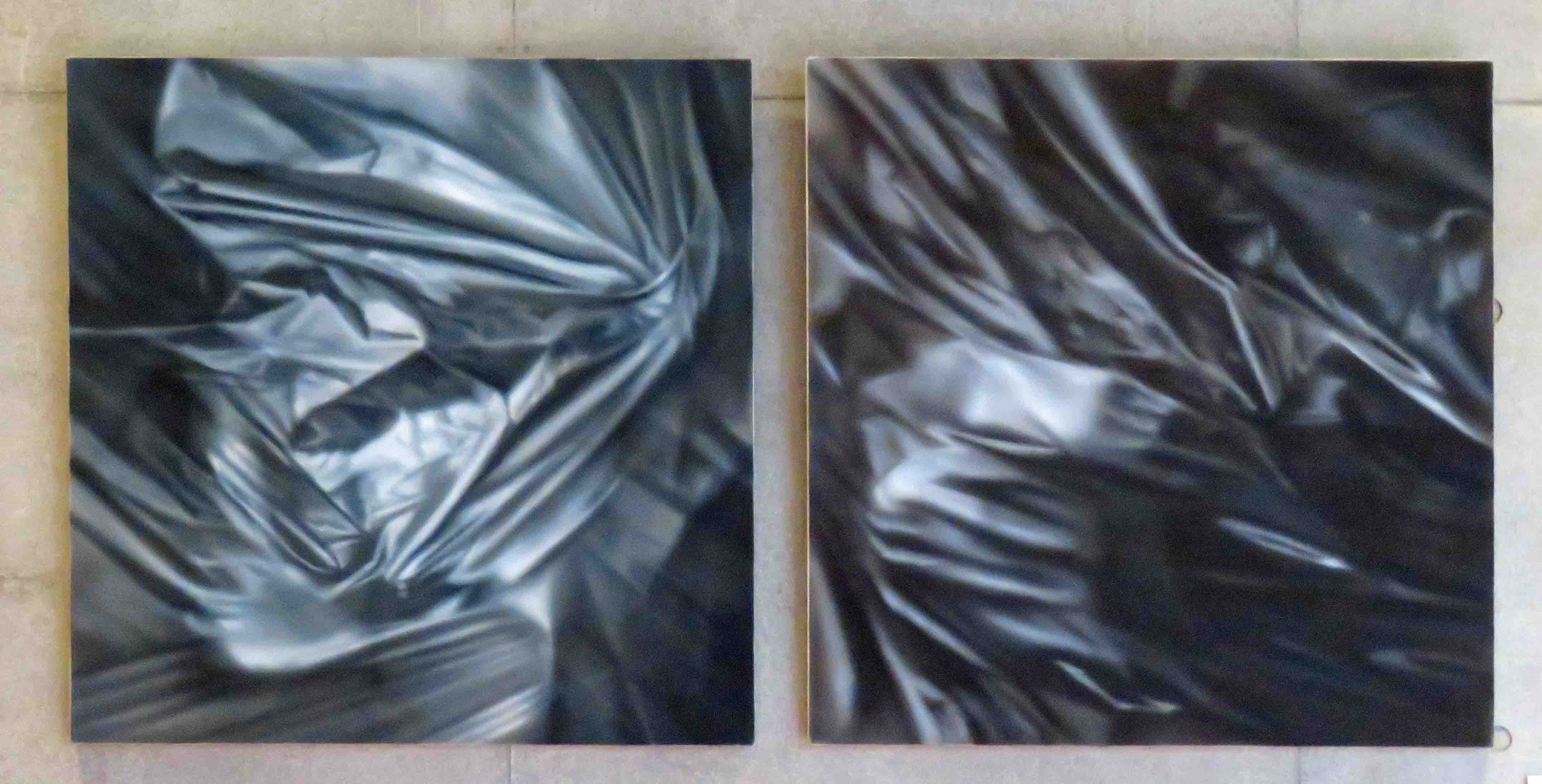 25硯川 秀人Garbagebagsキャンバス、アクリル、エアーブラシ昨年、Garbagebagsのタイトルで個展を行った。大作6点。ゴミ袋の表面をリアルに、圧倒される大きさに驚いてほしいのである。