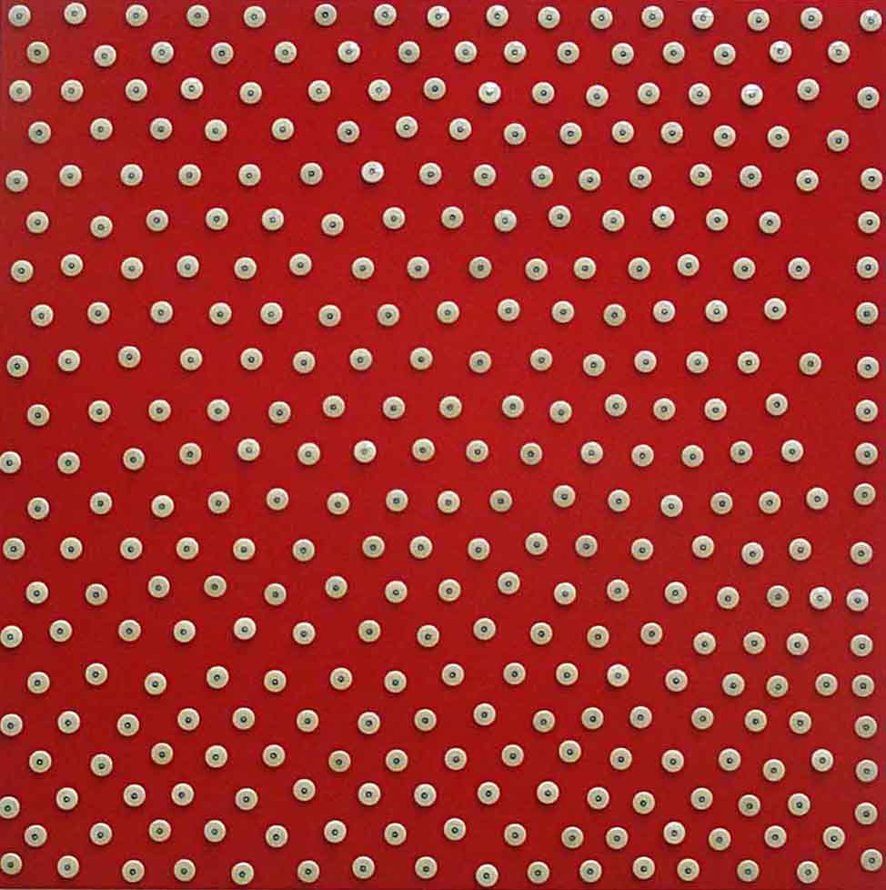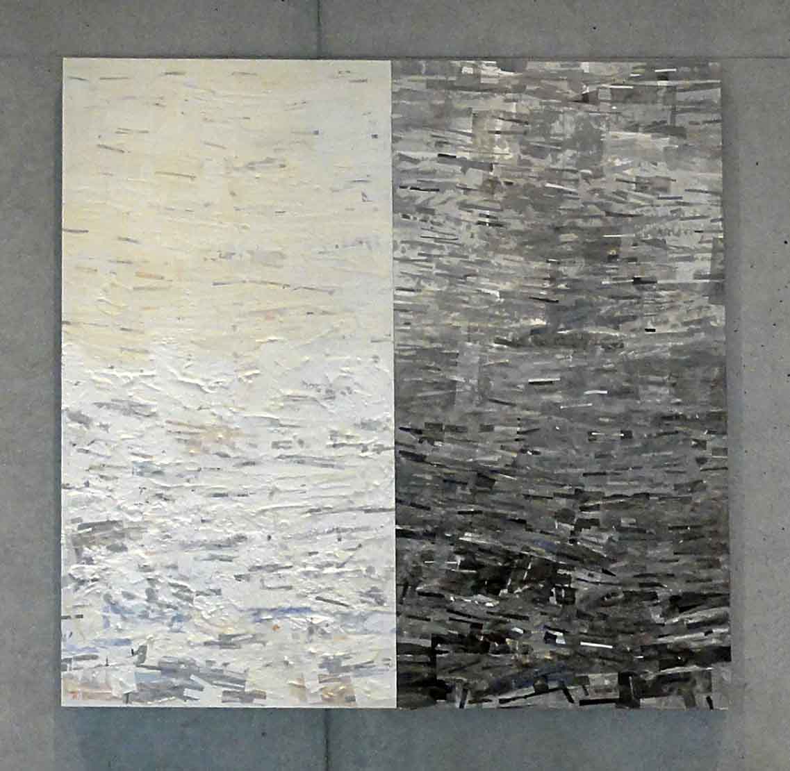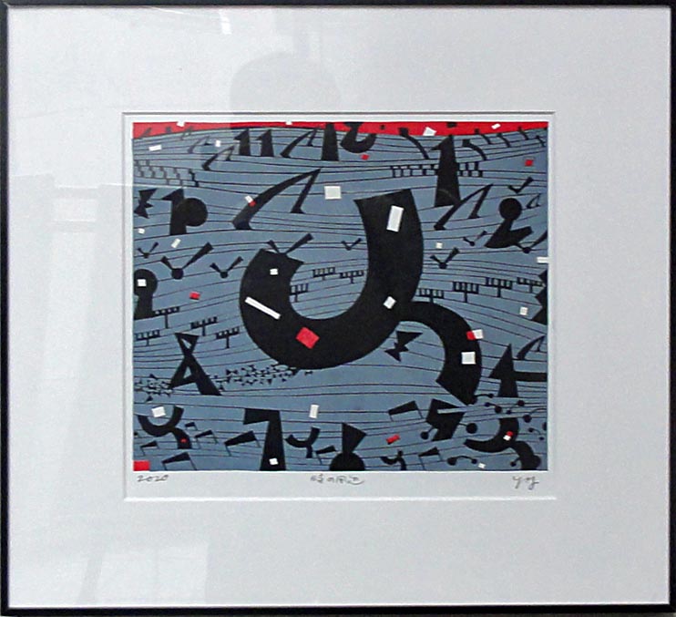 アクリル絵の具 | 内にこもる閉塞の時期、体も変調していく今こそ、次の時に向かう勇気を持つ為、自分を鼓舞する。表と裏もなく、過去と未来の様にガラス面で光で融合する魔訶不思議な一枚の平面。 |  |