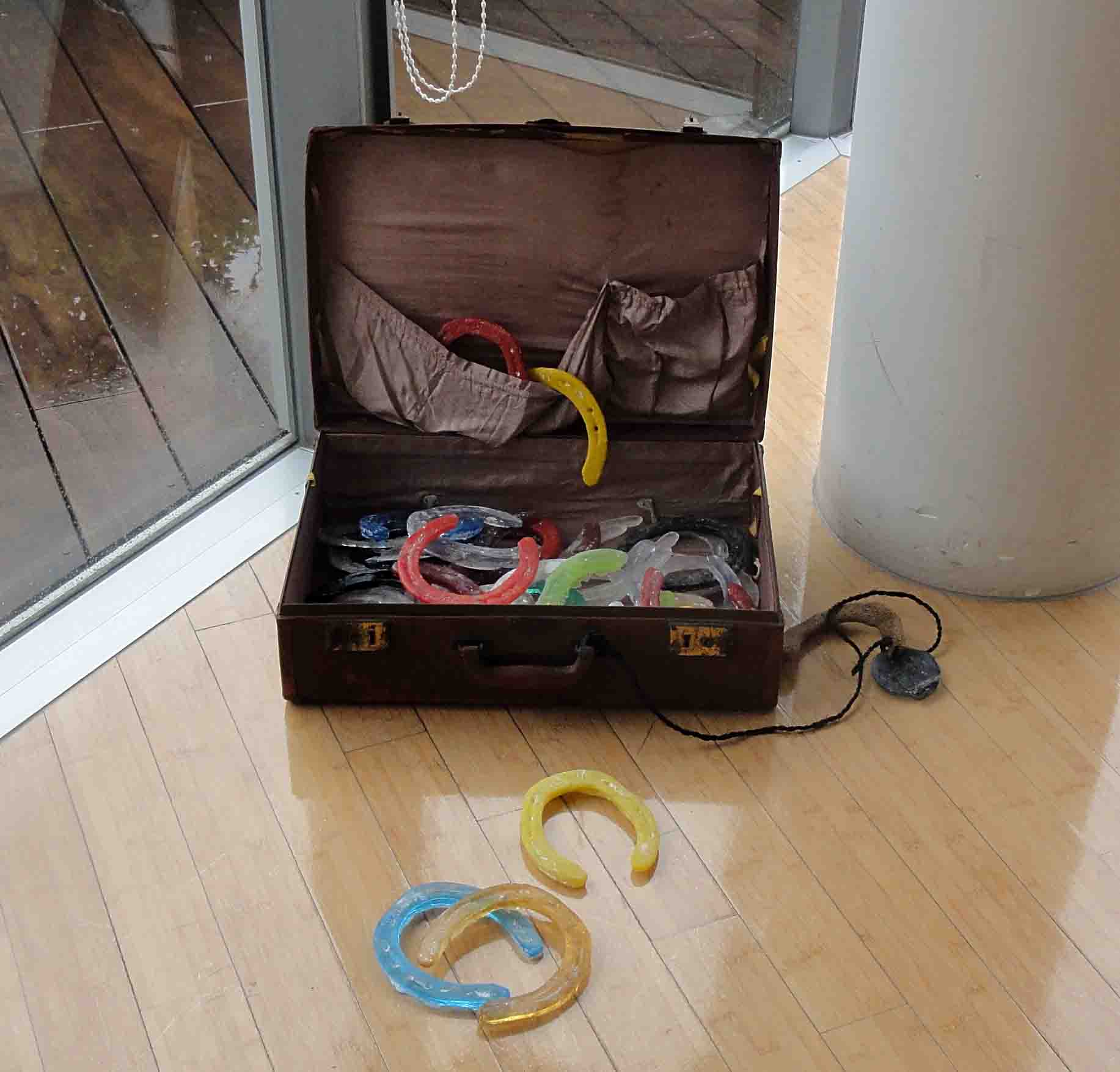 ガラス | ドイツから来た馬の名前です。その蹄鉄をガラスにおきかえ、古いカバンにつめました。動くことが制限された今、羽村市ゆとろぎまでの旅を心待ちにしています。 |  |