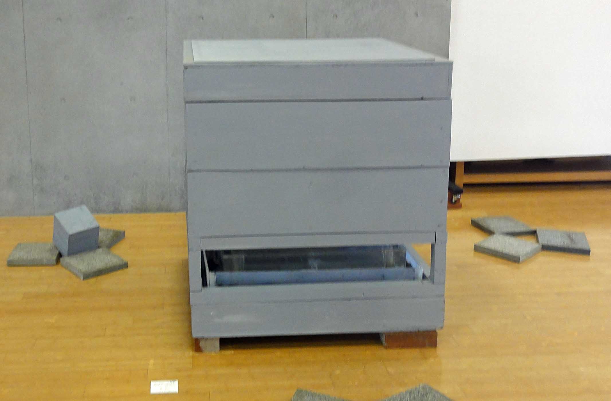| 51 | 東 裕二 | 水の定位についてⅢ(記憶すること・記録すること) | 水 LED その他 | 大きな立方体の上面に不規則に点滅する光小さな立方体には西暦が記されている。それぞれの時代に日本・世界で何があったか、自身又は人との繋がりの中で考えてみて下さい。 |  |