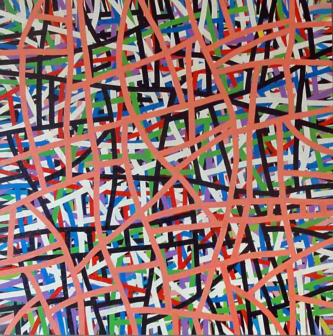| 35 | 田代 敦丕 | 「百の皮」〈ピンク・黒・緑〉 | アクリル キャンバス 100S | 一つの作品の中に複数のものが併存するように、次々と色の線を重ねていくことで作品を作ります。 |  |