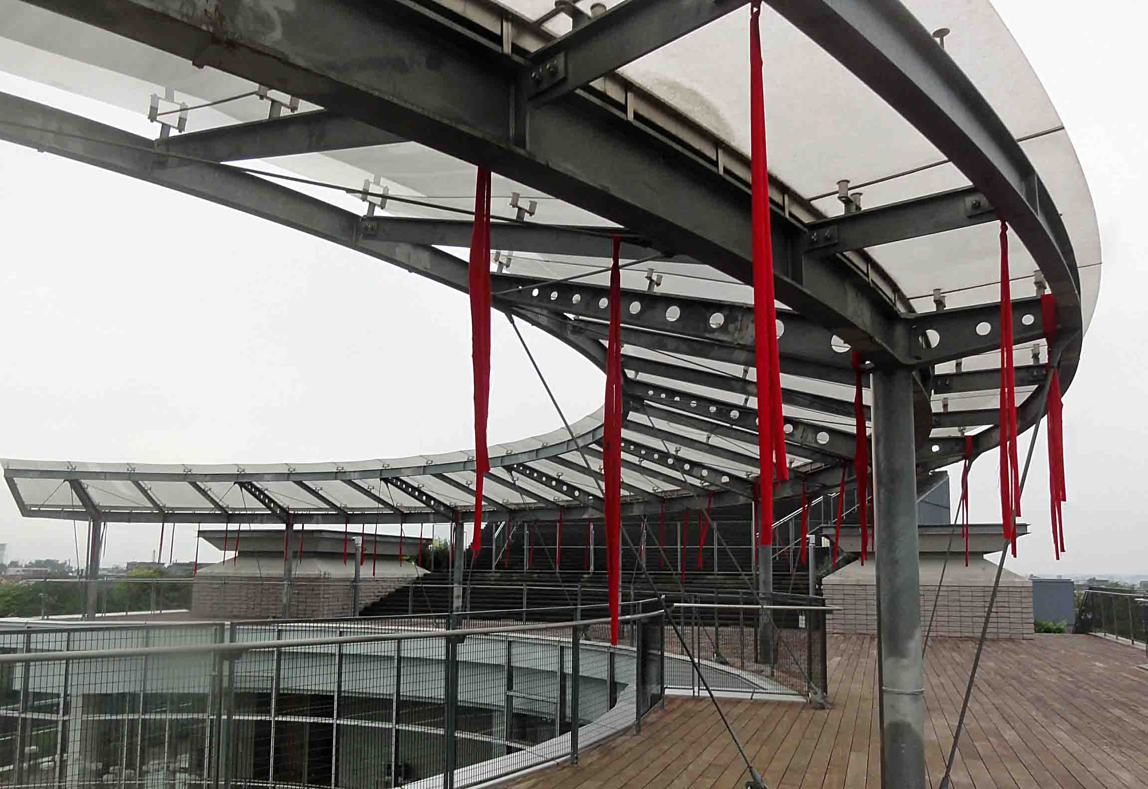 聞 コエル風 | プラスチックの輪 鉄 | 3階の庭、後ろに大きな森が控えている。ゆとろぎの建物には羽村の文化とやさしさとかっこ良さがにじみ出ている。そこに吹く風はこんな色が聞こえるのかなと思い作った。 |  |