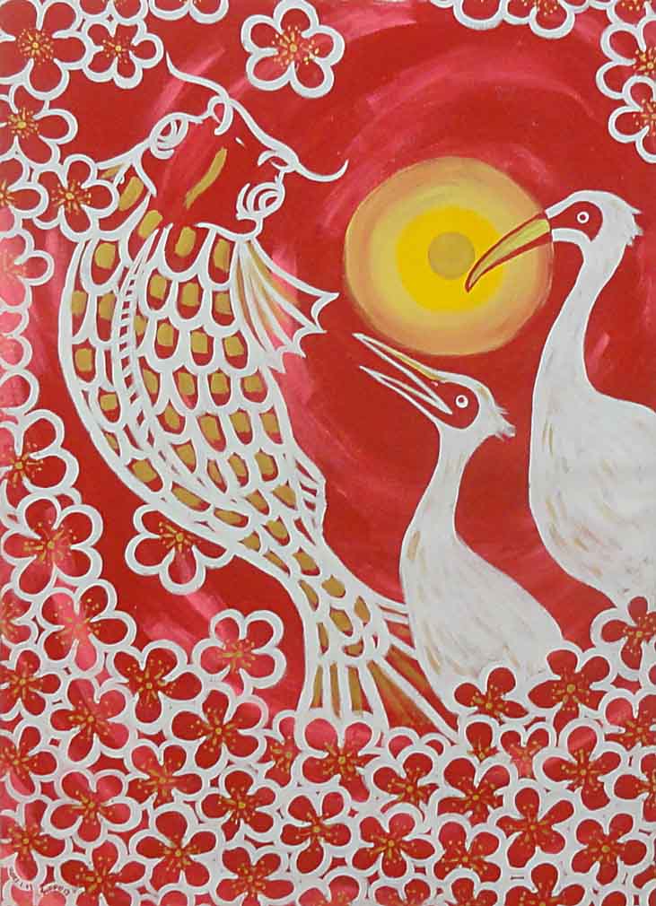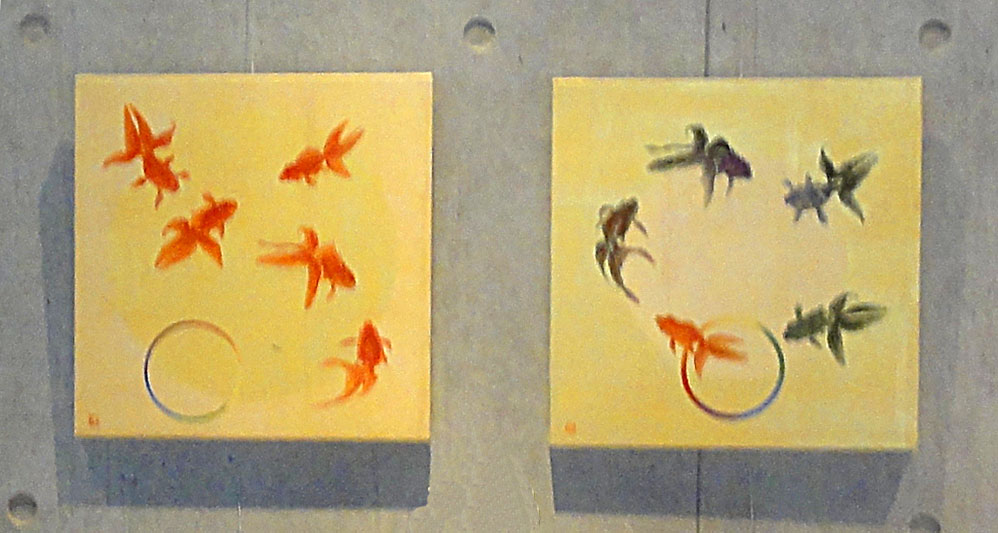 | 3 | 阿部 アヤ | Dream together | 和紙 墨 胡粉 岩絵の具 膠 | 5匹の金魚は5大陸(世界)を、虹の7色は希望を象徴しています。人種、性別、宗教を越えて全ての人々が平和に暮らせる世の中になることを願って。 |  |
