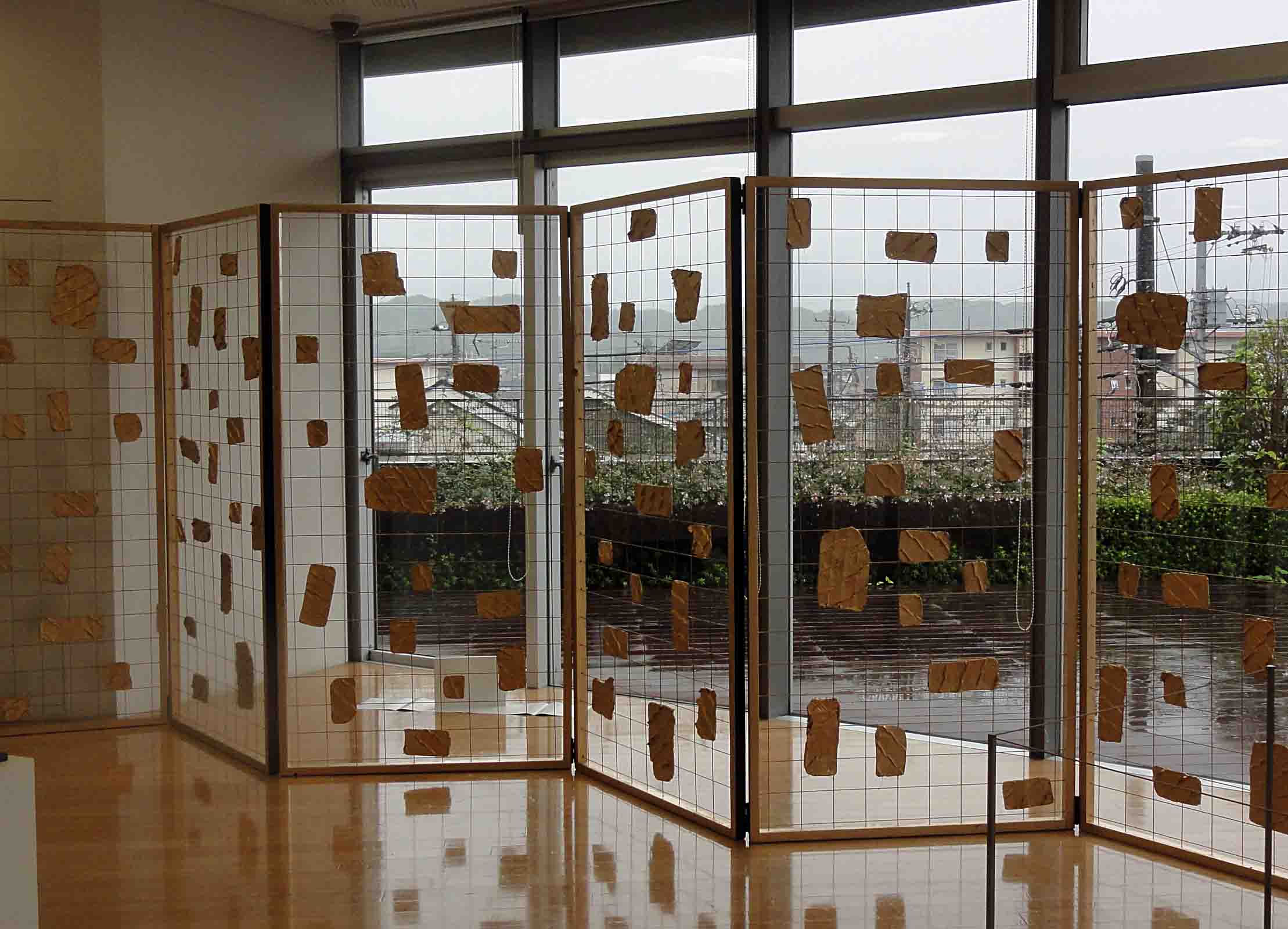 | 38 | 田辺 修 | 大地 | 和紙 | 小学校に勤めていた時、子どもの失敗した版画用紙で使えるところをノリでつなぎ合わせ大きくし、私の生まれた裏山の土を上から塗り作品を作ってきました。テーマは、大地から生まれ大地に帰っていく大地です。 |  |