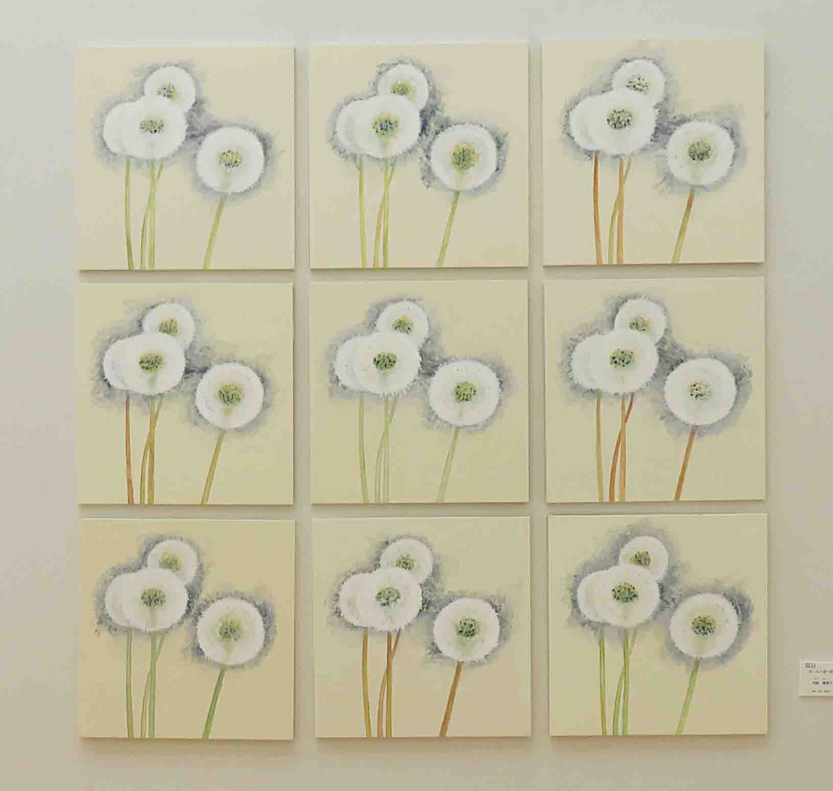 | 39 | 内藤 眞理子 | た・ん・ぽ・ぽ | 和紙、岩絵具、パネル | たんぽぽの花が咲いている。やがてしぼみ、綿毛へと姿をかえる。それは夕方から始まり、翌朝には白い丸い綿毛になっている。これから吹いてくる風を待つために。 |  |