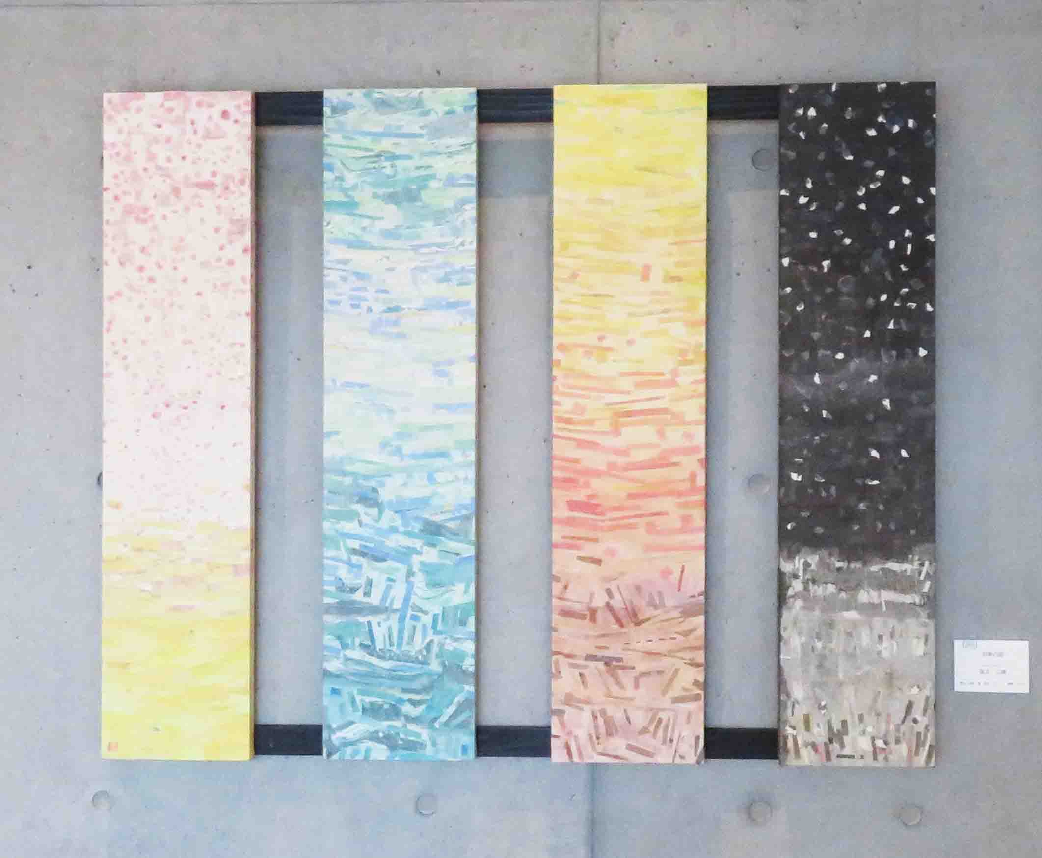 | 36 | 冨永 之廣 | 四季の図 | 水彩 墨 和紙 ジェッソ 漆喰 パネル | 日本の変化に富んだ四季の情景を表現しました。春:菜の花、桜。夏:谷川の翡翠の流れ。秋:谷川に映った紅葉。冬:荒野に降る雪。 |  |