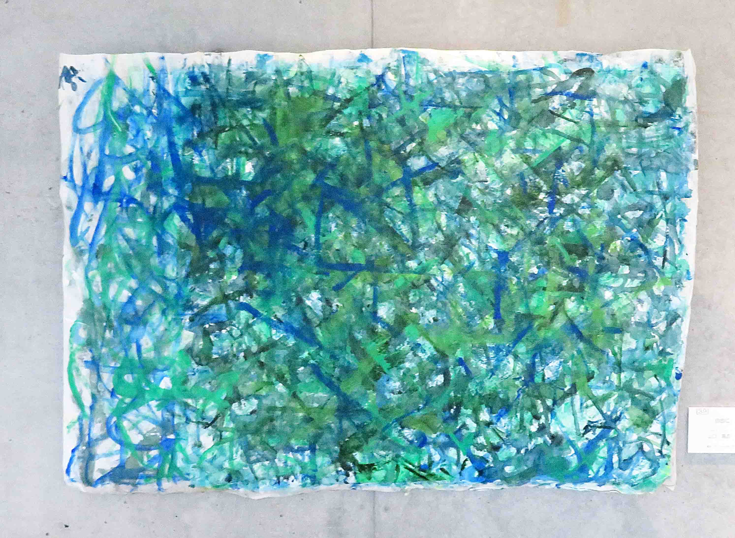 | 14 | 唐沢 貴子 | “海” | アクリル 油性ペン 岩絵具 | 創作和紙を土台として仕上げています。タイトル“海”は心理学でいう無意識を海と言うらしく、ユングの集団無意識に興味があります。 |  |
