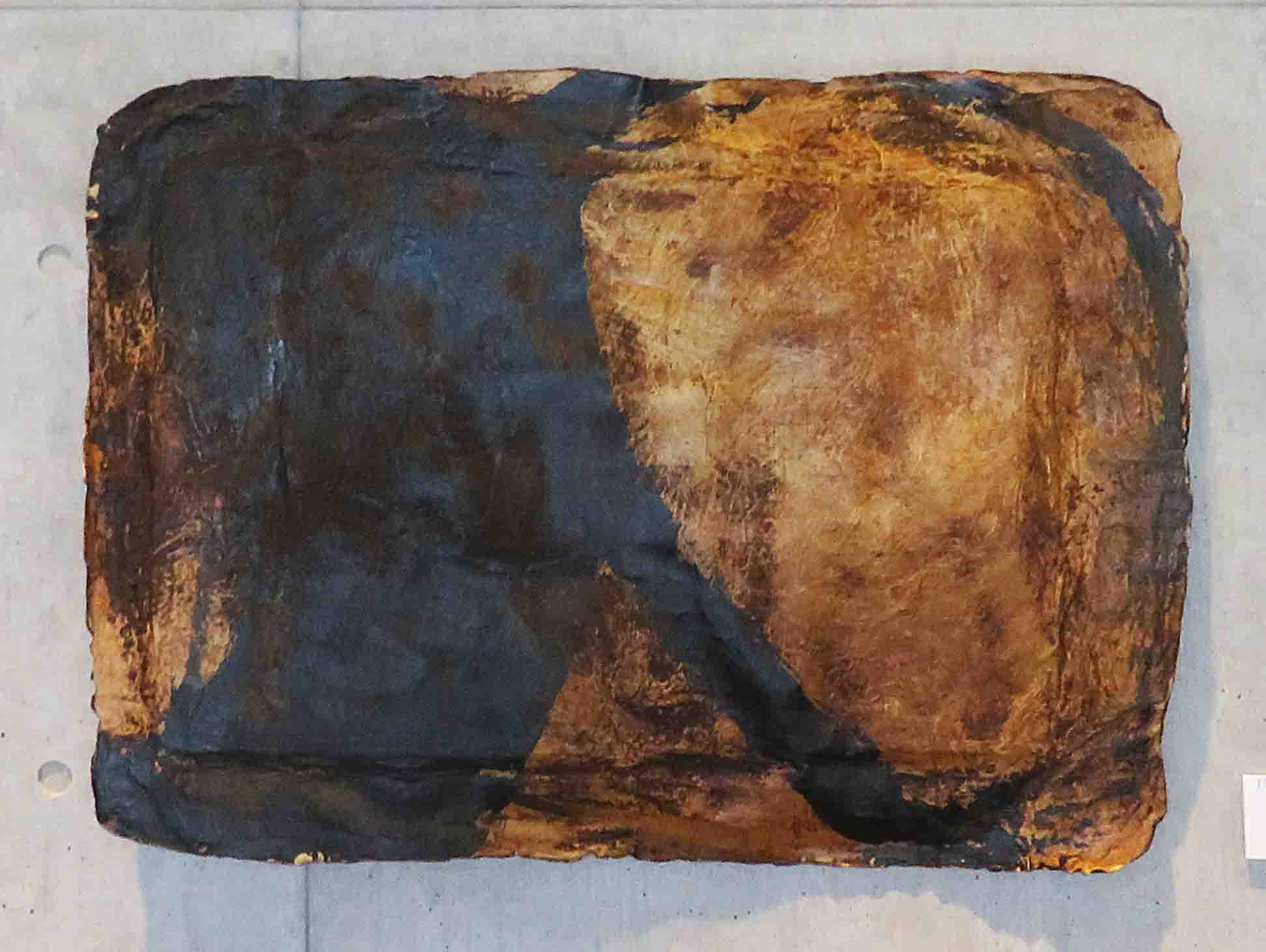 | 40 | 中川 迪彦 | どこへ? | 牛皮 木製パネル インキ ジェッソ油絵具 アキーラ | 数年前、牛皮をたくさんもらったのですがどう使うか思案しました。無策ながら複数作品をつくりました。2022年5月制作のうちの1点を展示致しました。 |  |
