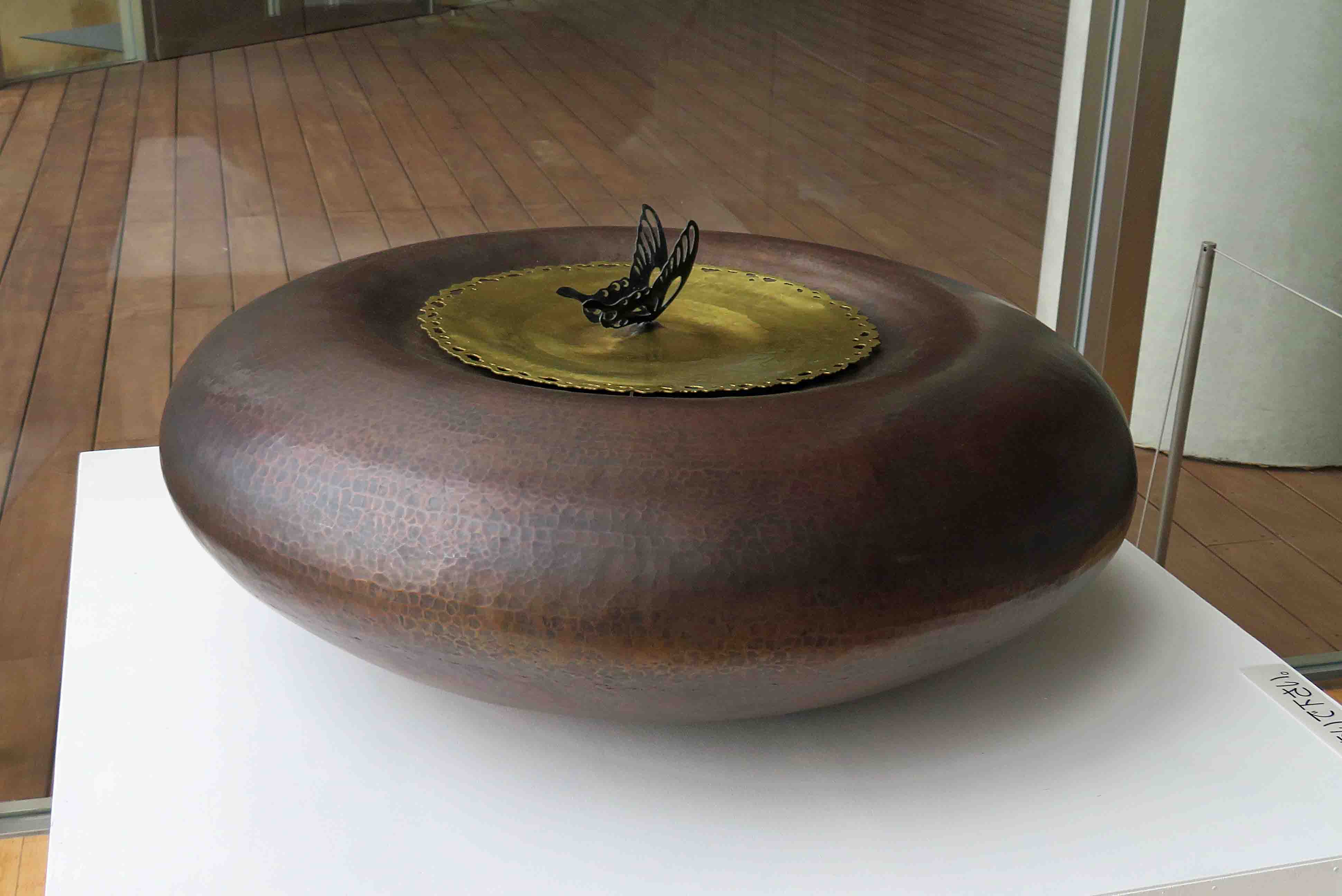 | 29 | 高野 雄生 | 廻 | 銅 真鍮 | 銅と真鍮の板を金槌で叩いて作りました。中心のクロアゲハは生と死を表現しています。 |  |