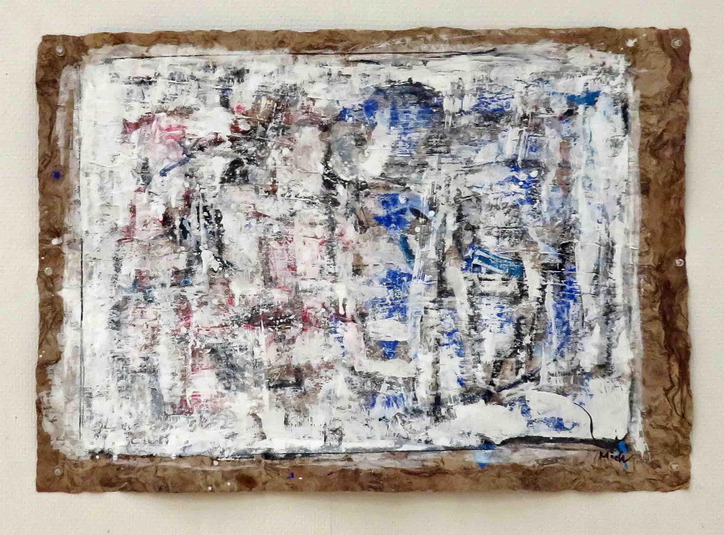 | 14 | 片山 憲二 | 樹林シリーズ25 (木版) | 和紙 アクリル | 木版技法で樹林をイメージした心象風景です。摺った表面を削ったり、紙をコラージュしたりして樹林のイメージを表現しました。 |  |