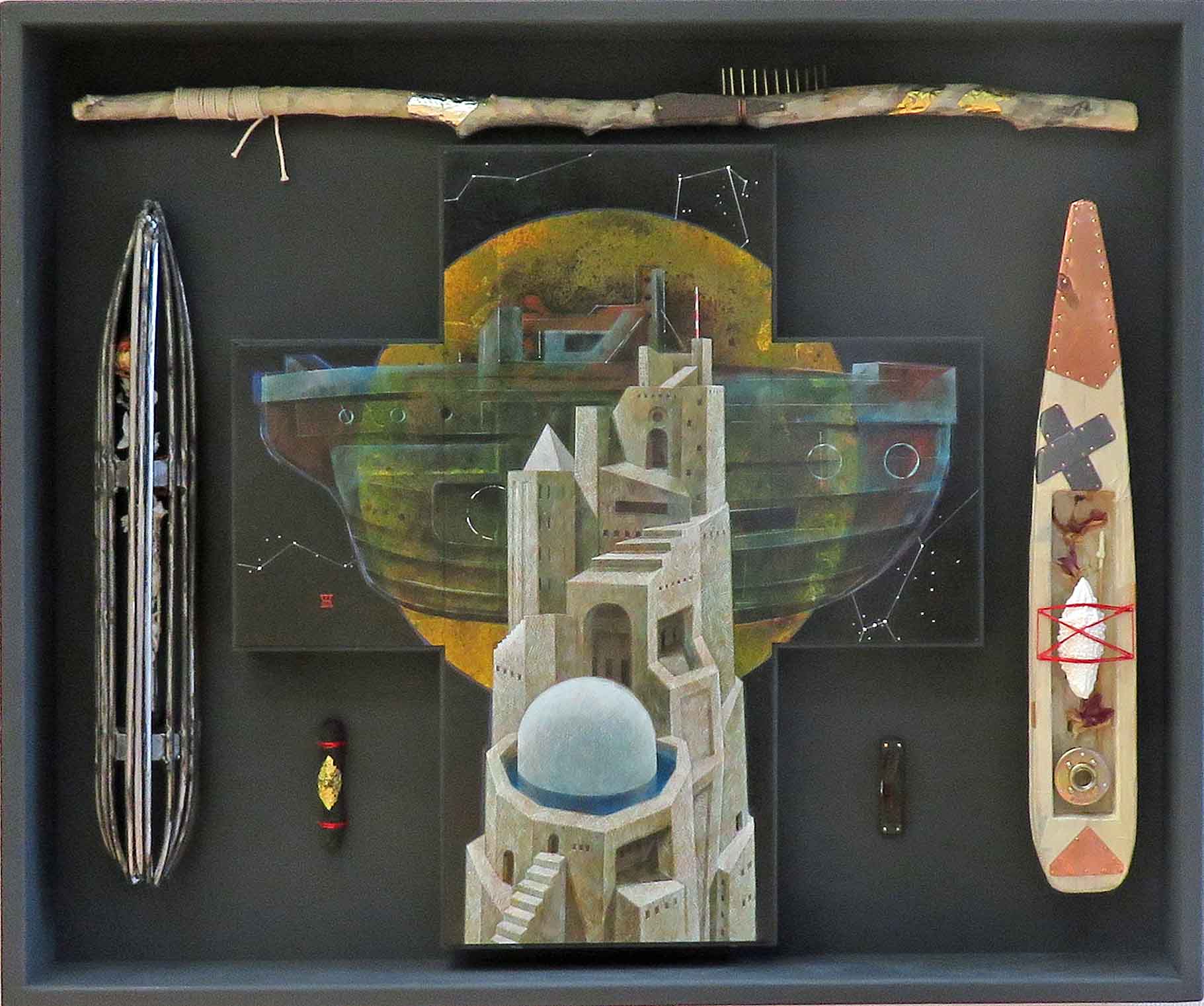 | 23 | 佐藤 勤 | 架 | テンペラ 油彩 ミクストメディア | 此方とあちらを繋ぐものとしてイメージ出来る橋や船の役割を造形化しています。現代は色々な対立で戦火が絶えません、互いの非難の結果、罪のない未来を背負う子供たちが殺されています。この様な理不尽な状況に一石を投じたいと思い制作しています。 |  |