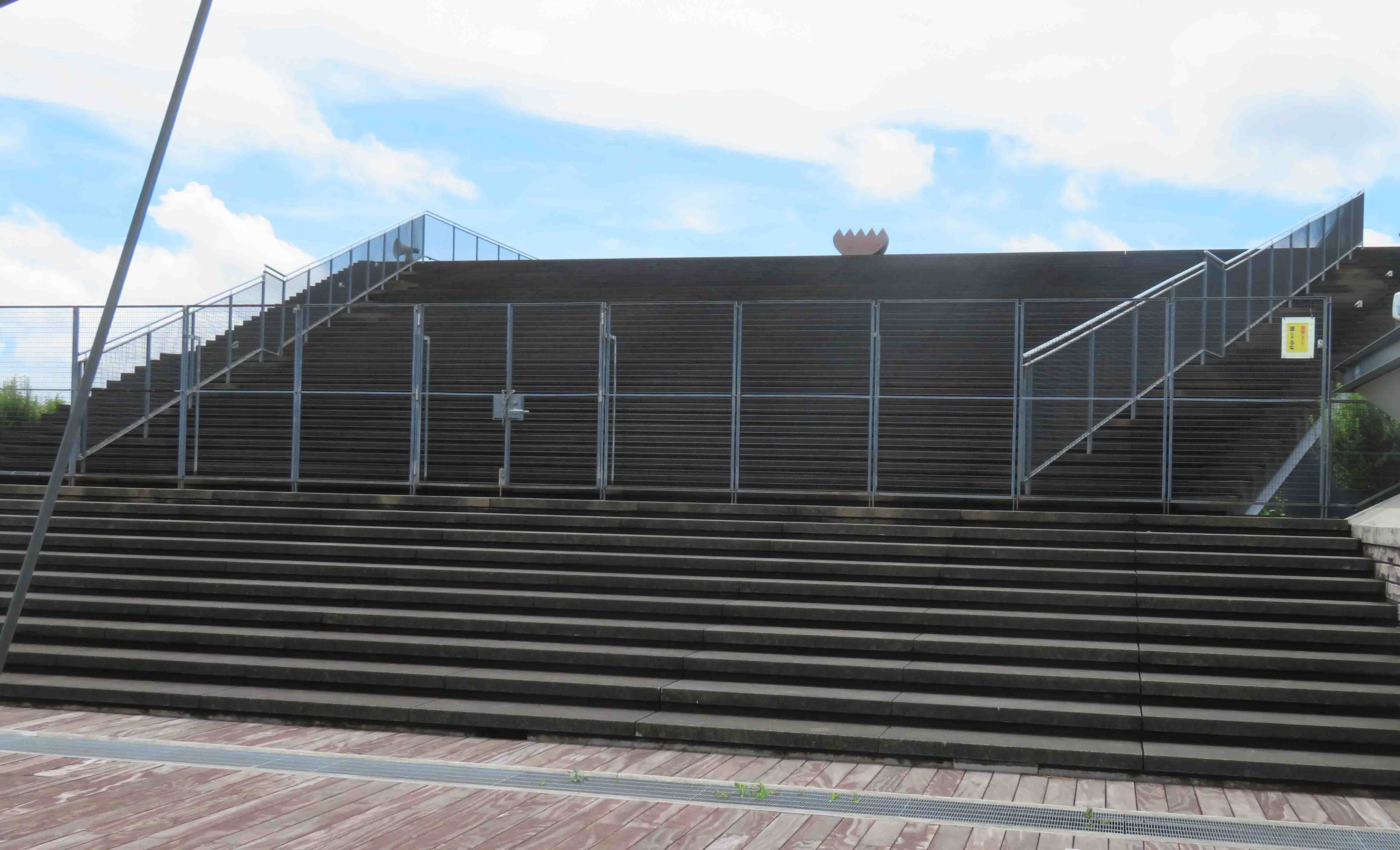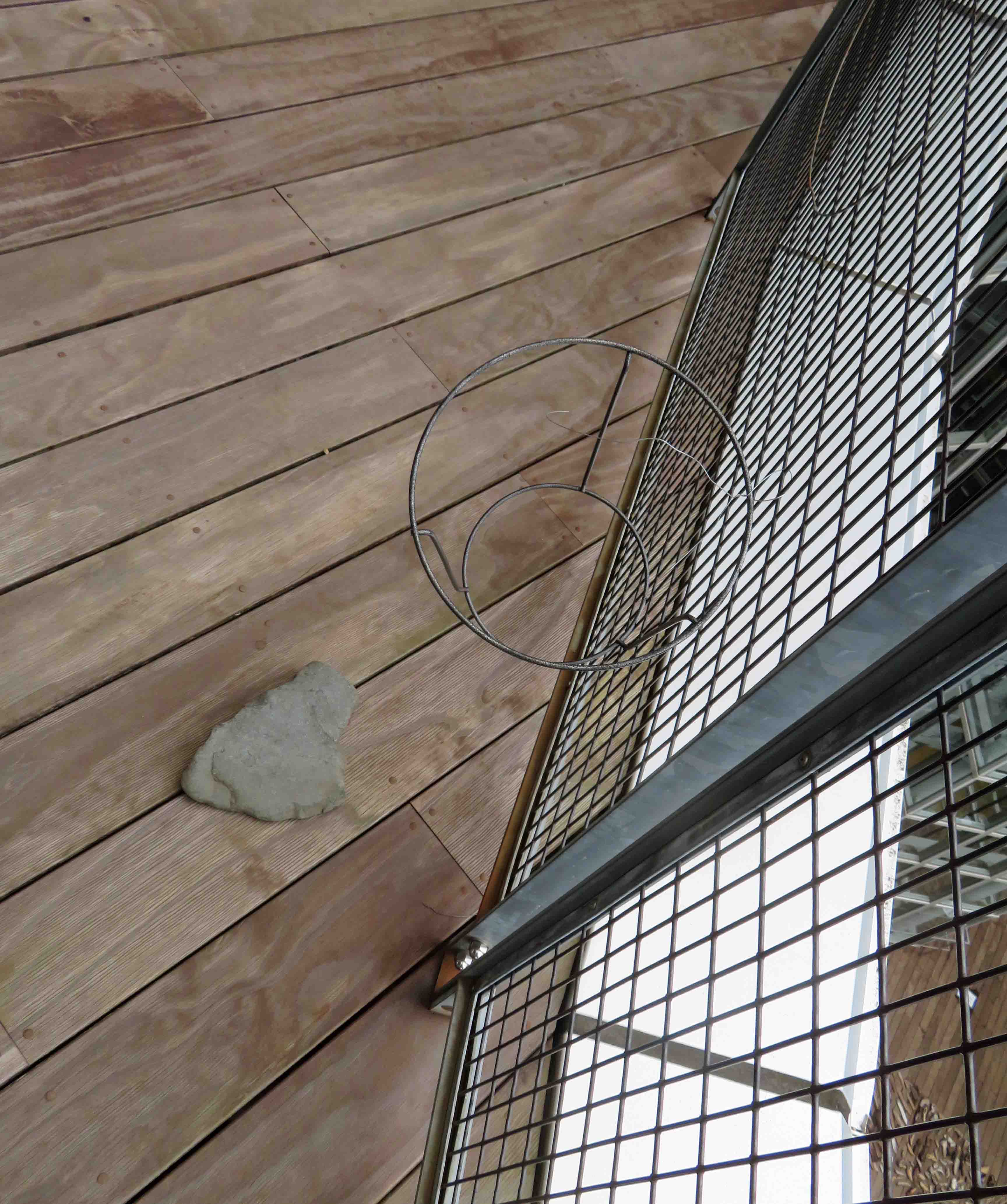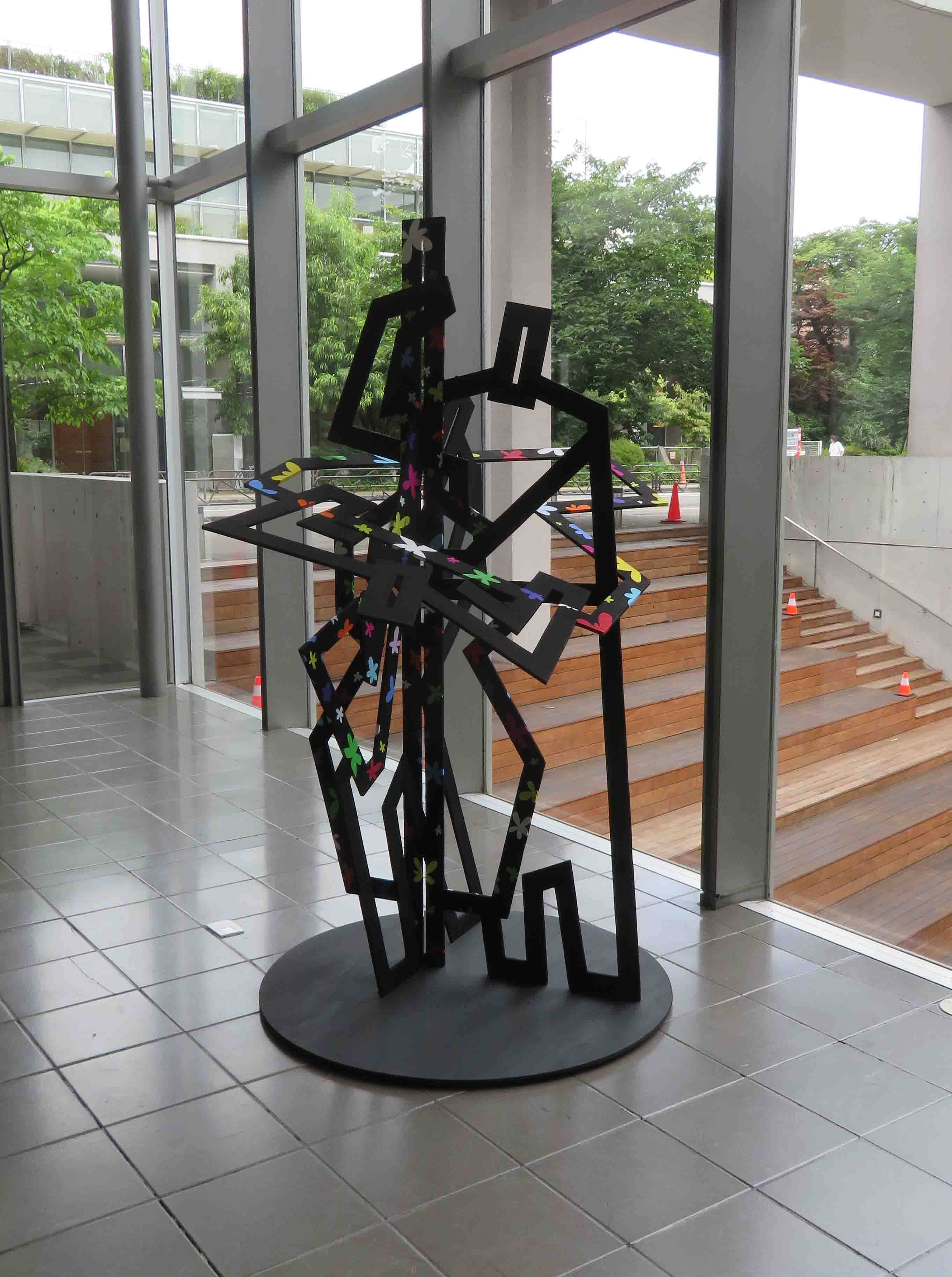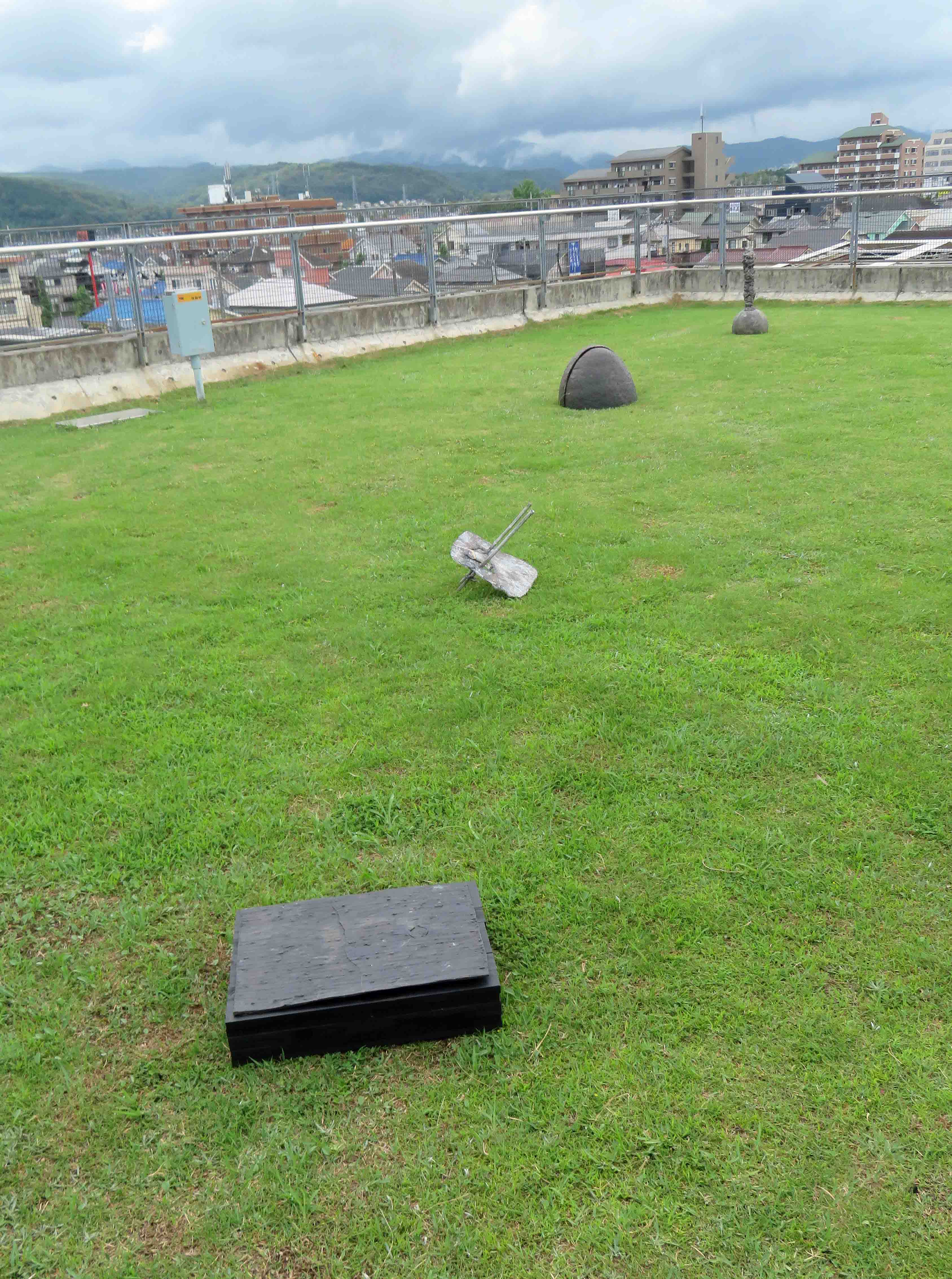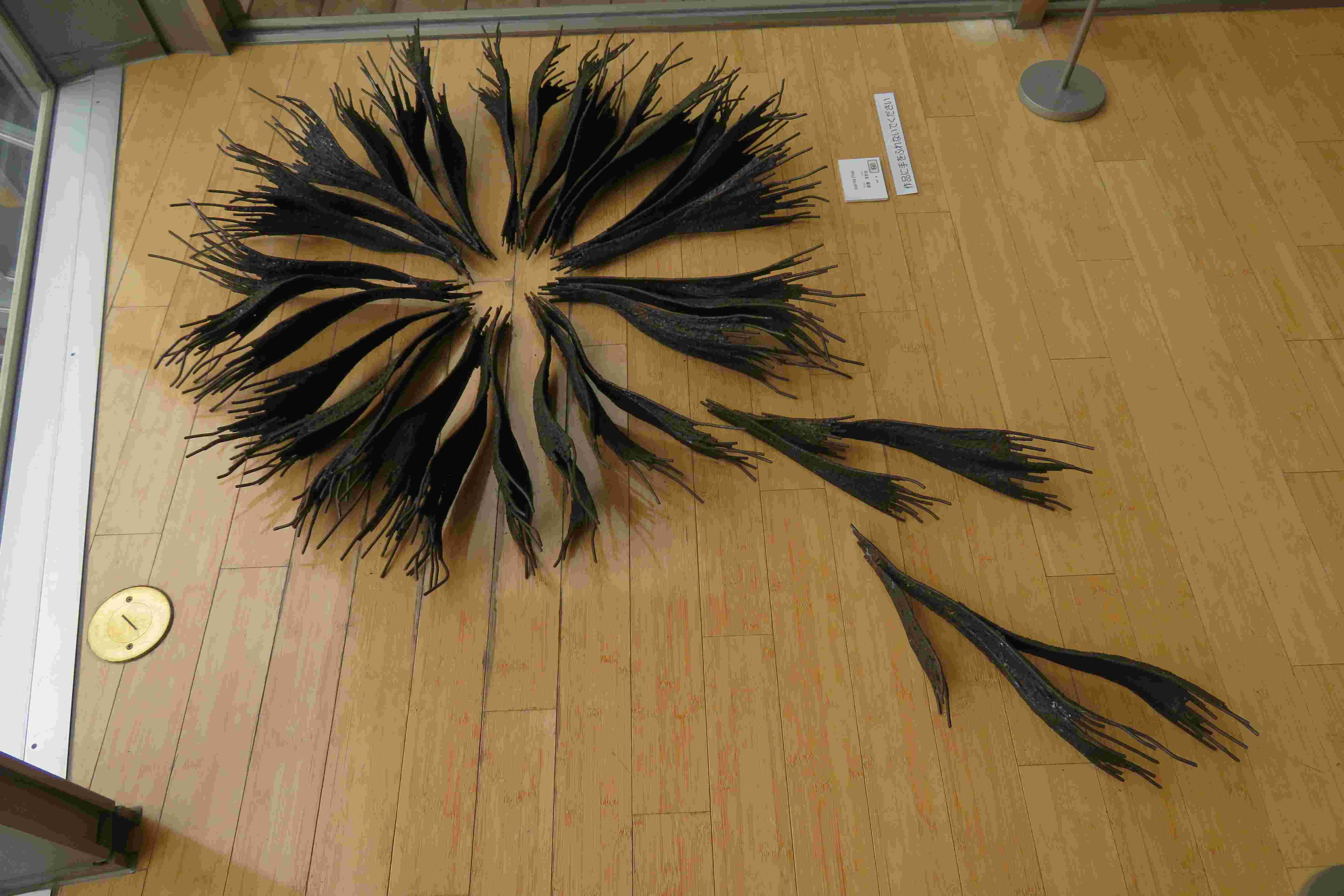 | 61 | 望月 久也 | ゴホウ 五峰 | 鉄 | 二作品ともにとんがりがあります。屋上の作品は太く短く並んで五本、室内の作品は細く長く三十六本ずつ、上下から交わっています。 |  |