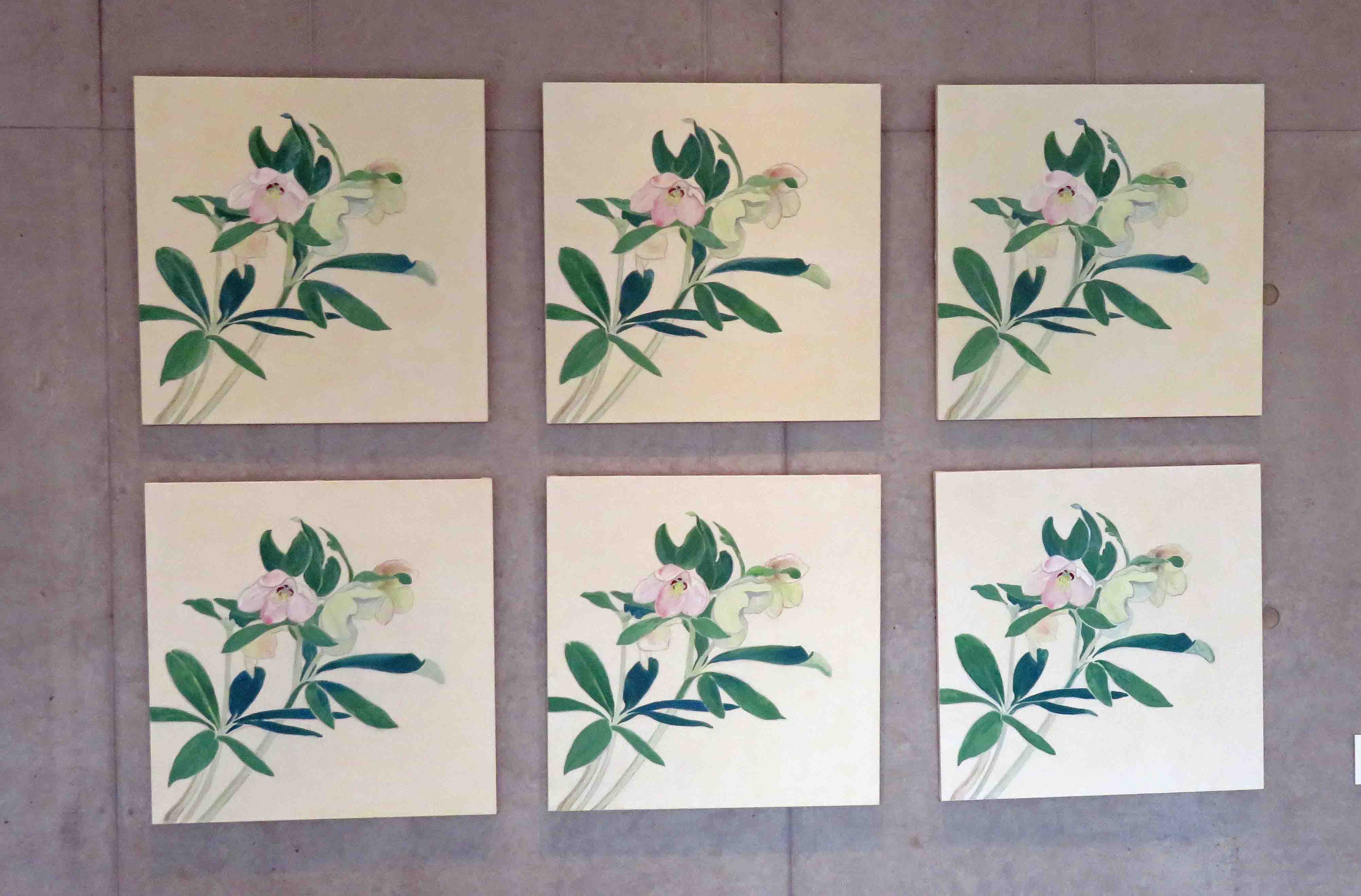 | 39 | 内藤 眞理子 | おくりもの | パネル 和紙 顔料 | 数年前いただいたクリスマスローズの苗。しばらくは成長が止まったかのようだったが、今年はいくつも蕾をつけていた。 |  |