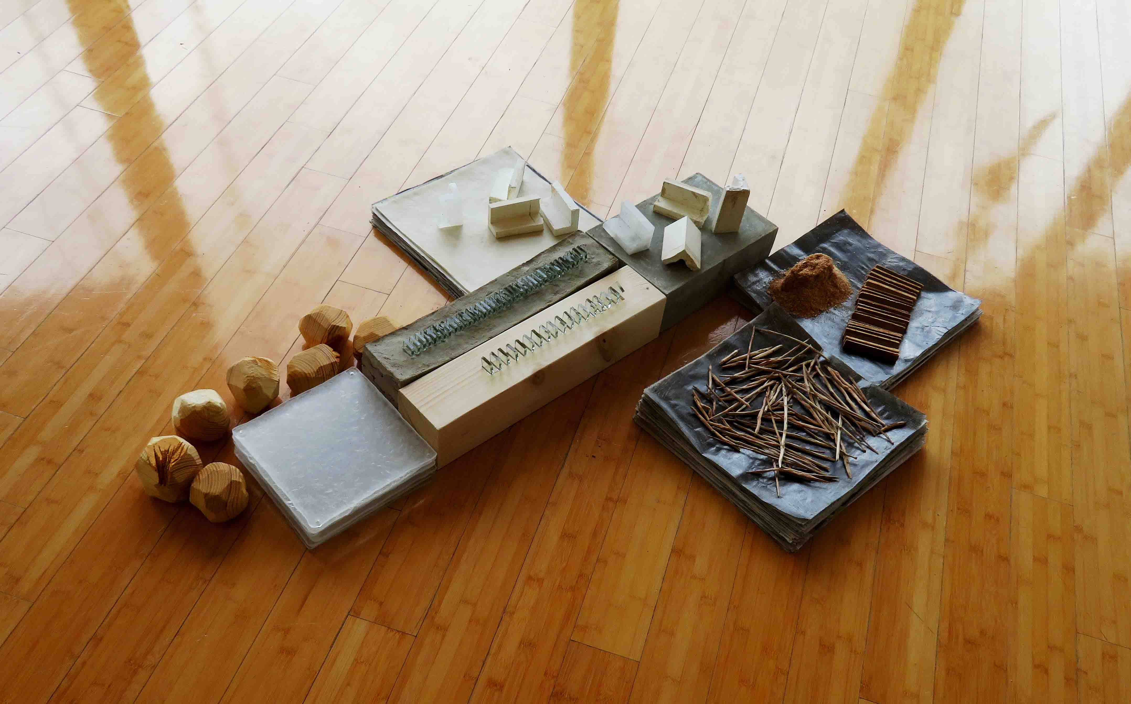 | 51 | 平田 俊介 | 表面(地面) | 木 ガラス 紙 粘土 等 | 地面をつくる。表面をつくる。その上に断片を散らばらせる。 |  |