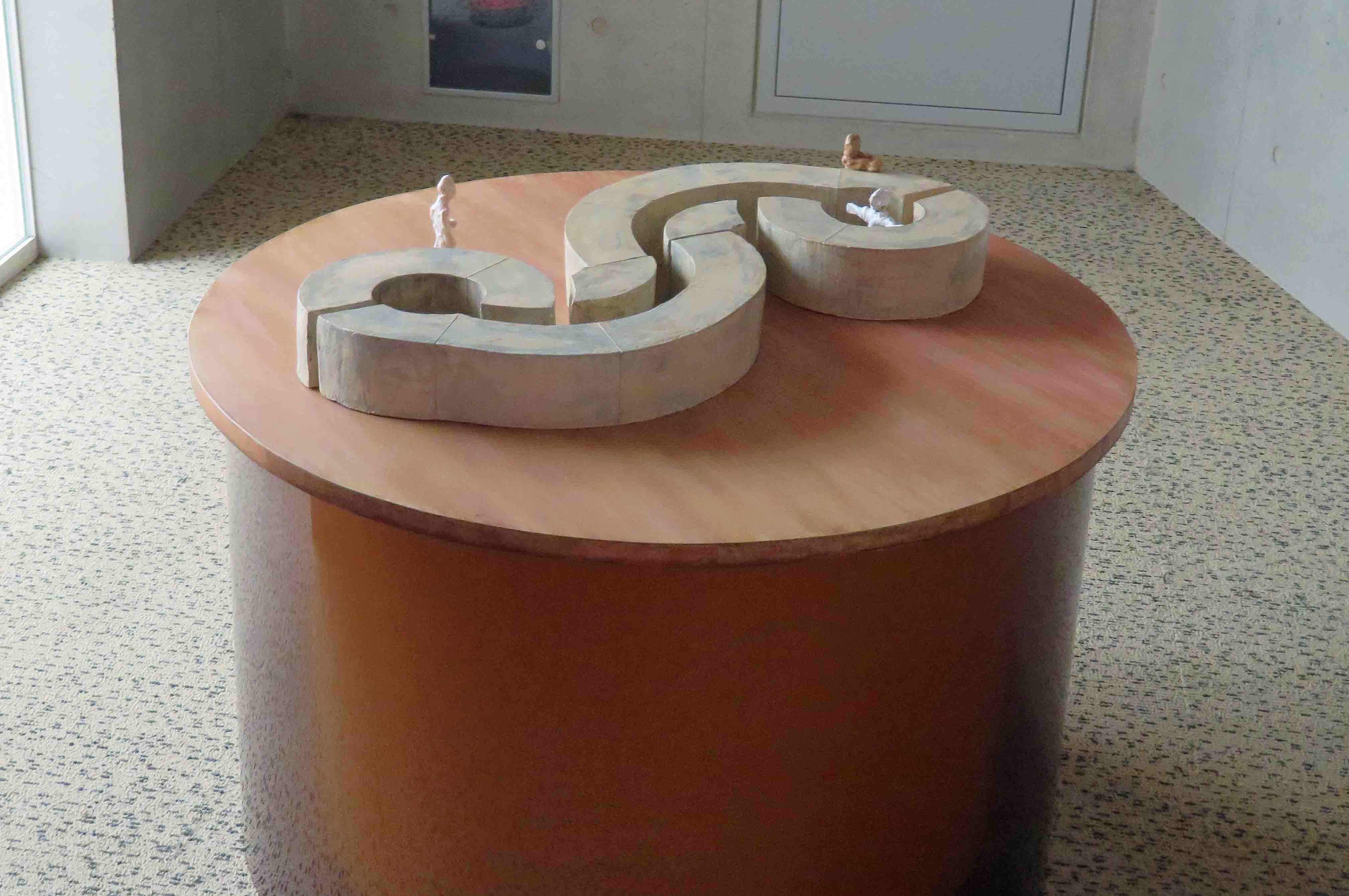 | 44 | 永沼 直孝 | 「握手する道」 | セラミック | 一見殺風景なジオラマ風模型。公園とか広場に設置する中を歩く彫刻を意識した。人の或るありふれた日常と平和へのメッセージ。 |  |